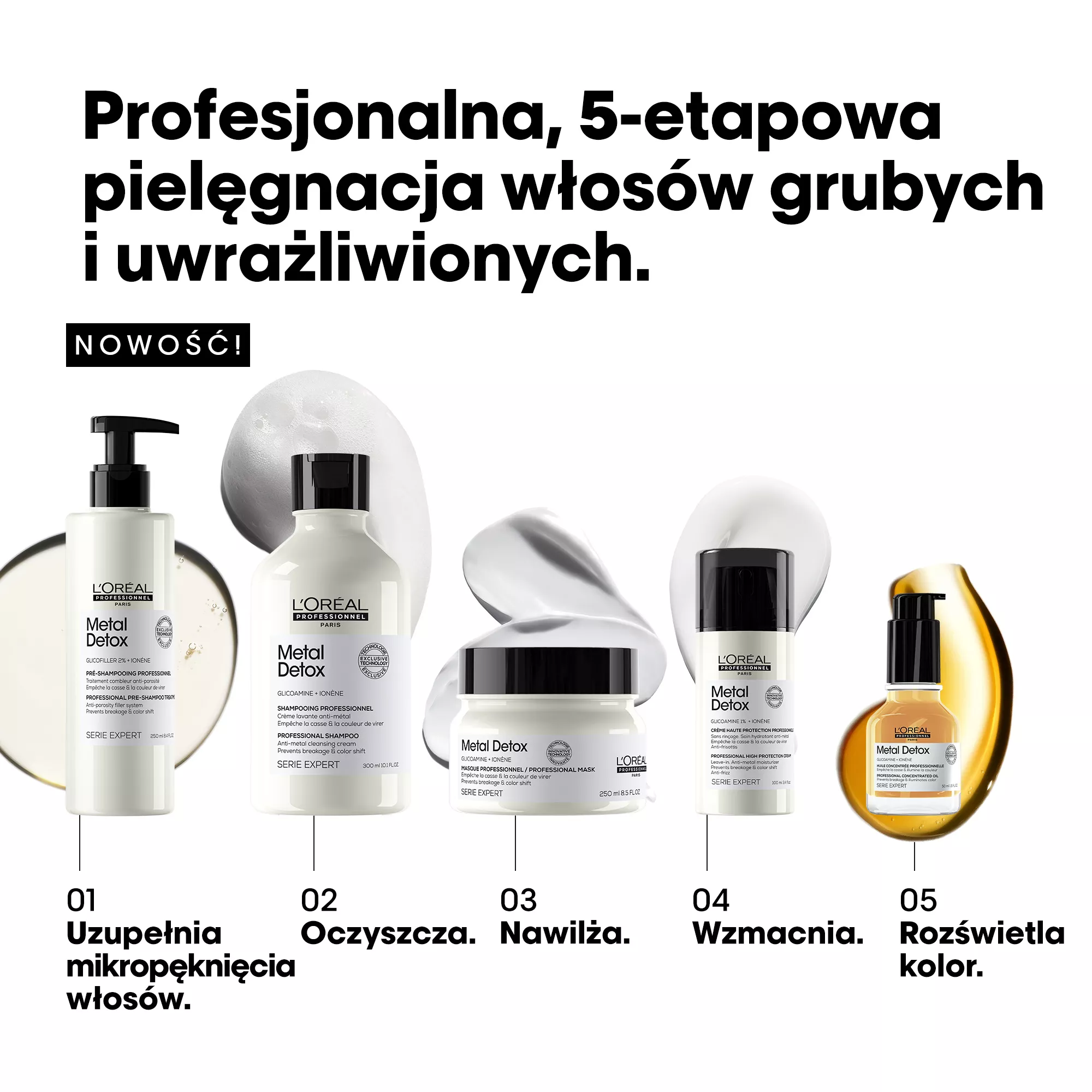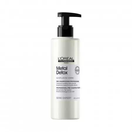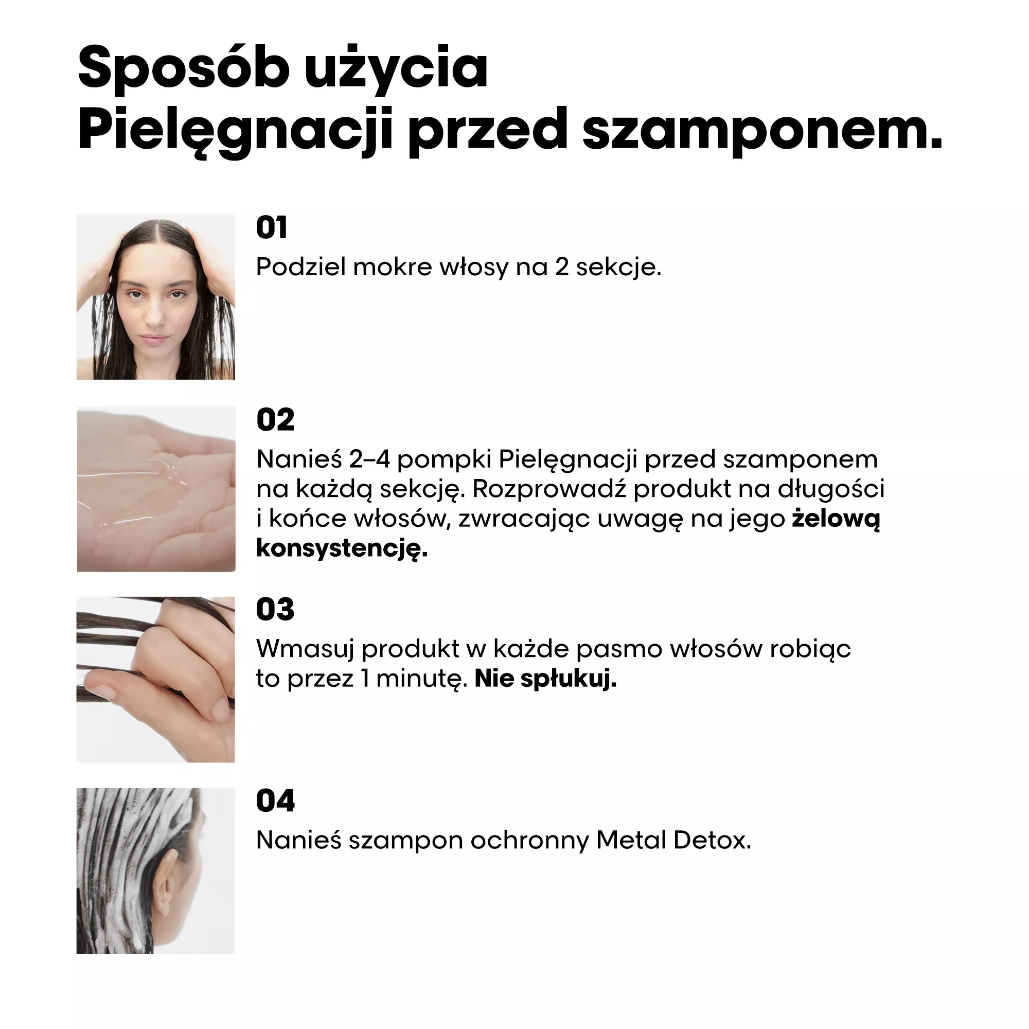 1. Podziel mokre włosy na 2 sekcje. 2. Nałóż od 2-4 pompek produktu, w zależności od długości włosów. Wmasuj produkt w długości i końce (robiąc to przez około 2 minuty), aż pojawi się lekka piana. 3. Nie spłukuj. Jeśli stosujesz technikę warstwowego nakładania produktu nałóż szampon bezpośrednio na Pielęgnacje przed szamponem Metal Detox, następnie spłucz i zastosuj maskę oraz olejek Metal Detox.
