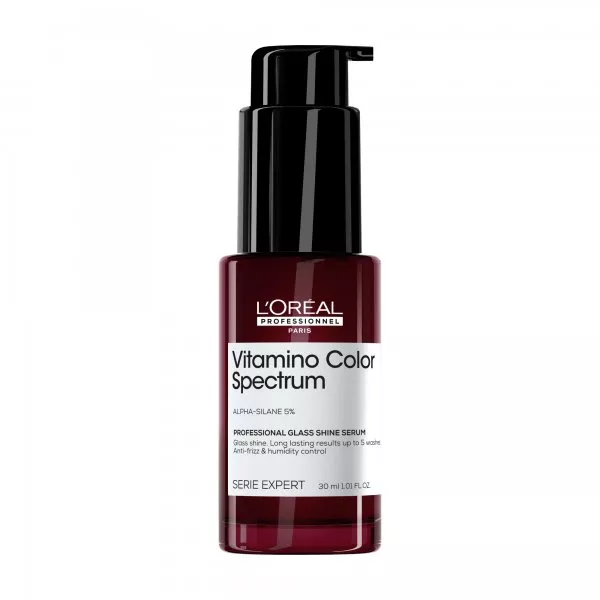 Odkryj opatentowane serum bez spłukiwania do włosów farbowanych z gamy Vitamino Color Spectrum od L'Oréal Professionnel Paris. Serum zapewnia natychmiastowy połysk z efektem tafli i długotrwałe rezultaty aż do 5 myć***. Chroni włosy przed puszeniem do 72 h**** i zabezpiecza je przy wilgotności powietrza do 80%. Jednocześnie chroni pasma przed wysoką temperaturą do 230ºC***** urządzeń do stylizacji.