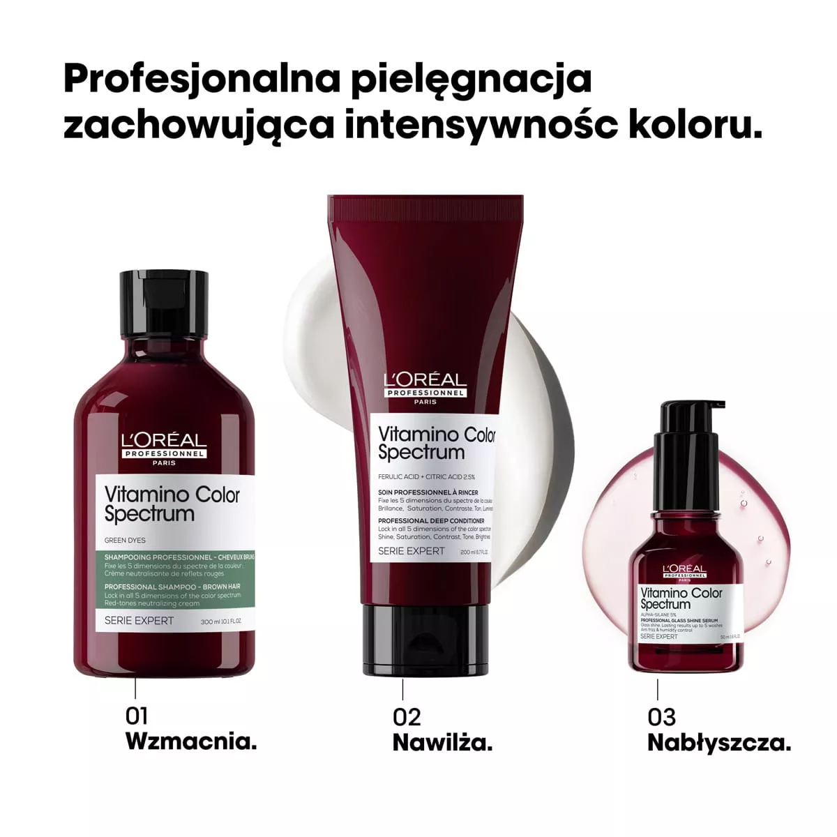 Pielęgnacja Vitamino Color Spectrum pomaga zachować intensywność koloru włosów od pierwszego dnia koloryzacji aż do 100 dni*. Zapewnia niezwykle wysoki połysk tafli lustra oraz bogate i żywe kolory. Włosy są oczyszczone, natychmiast odżywione i mocniejsze.