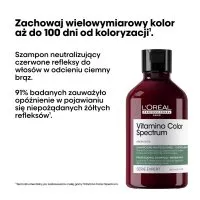 Szampon Green Dyes z gamy Vitamino Color Spectrum od L'Oréal Professionnel Paris został opracowany specjalnie do włosów w odcieniach ciemnego brązu. Dokładnie oczyszcza włókna włosów i zapewnia im natychmiastowe wzmocnienie oraz odżywienie. Dzięki zielonym pigmentom natychmiast neutralizuje niechciane czerwone odcienie na włosach. Wzbogacona o składniki odżywcze, kremowa formuła zapewnia efekt we wszystkich 5 wymiarach koloru²: ultramocny połysk tafli, bogate kolory, optymalną głębię odcieni koloru, brak niepożądanych refleksów oraz przejścia tonalne pomiędzy jasnymi i ciemnymi refleksami.