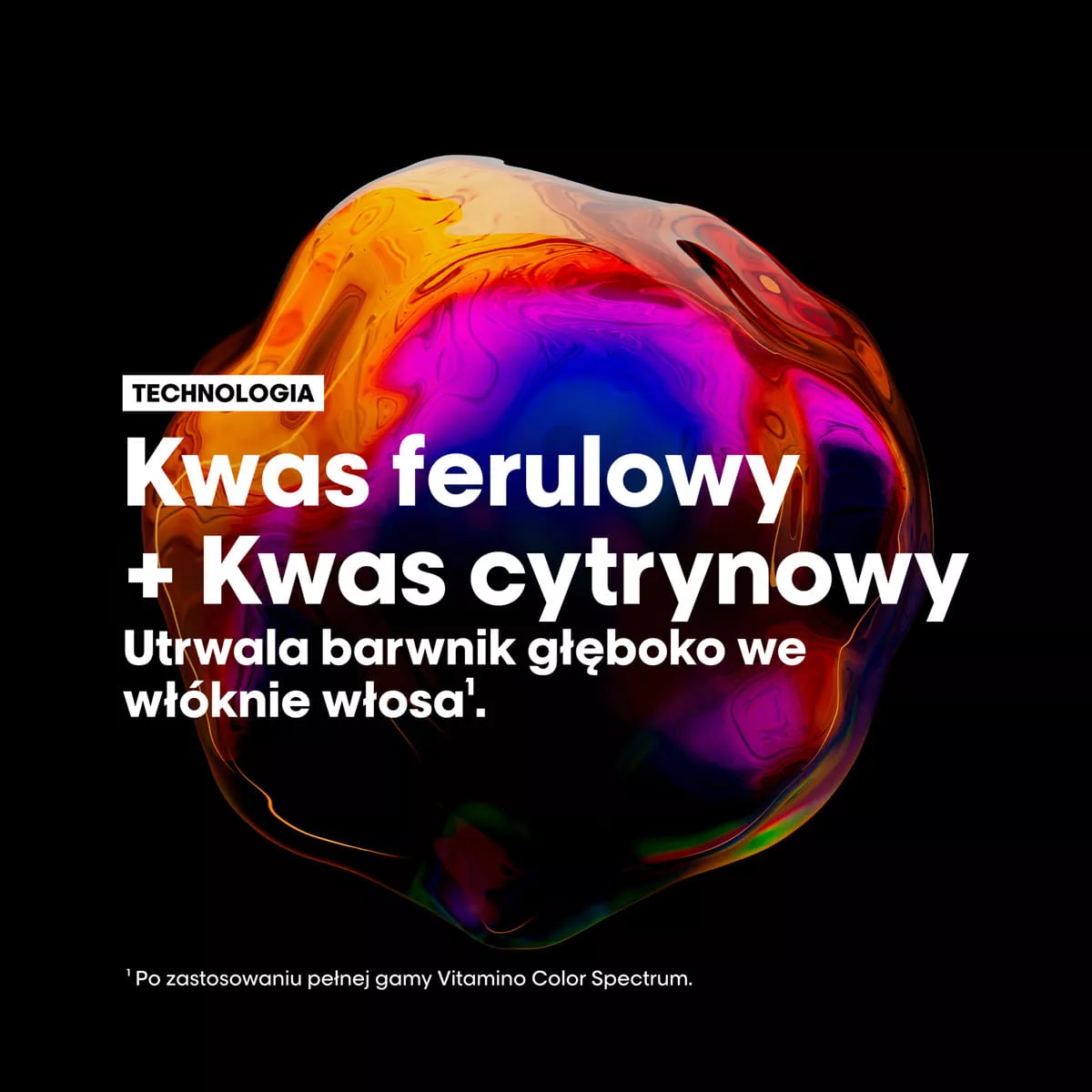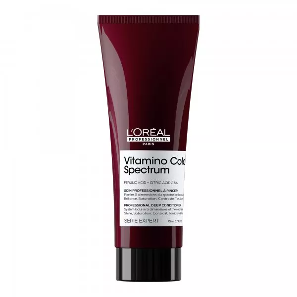 Odżywka z gamy Vitamino Color Spectrum od L'Oréal Professionnel Paris została opracowany dla wszystkich rodzajów włosów farbowanych. Kosmetyk wzmacnia włosy od wewnątrz, dzięki czemu stają się mocniejsze, gładsze i bardziej zdyscyplinowane. Wzbogacona o składniki odżywcze, kremowa formuła zapewnia efekt we wszystkich 5 wymiarach koloru**: ultramocny połysk tafli, bogate kolory, optymalną głębię odcieni koloru, brak niepożądanych refleksów oraz przejścia tonalne pomiędzy jasnymi i ciemnymi refleksami.