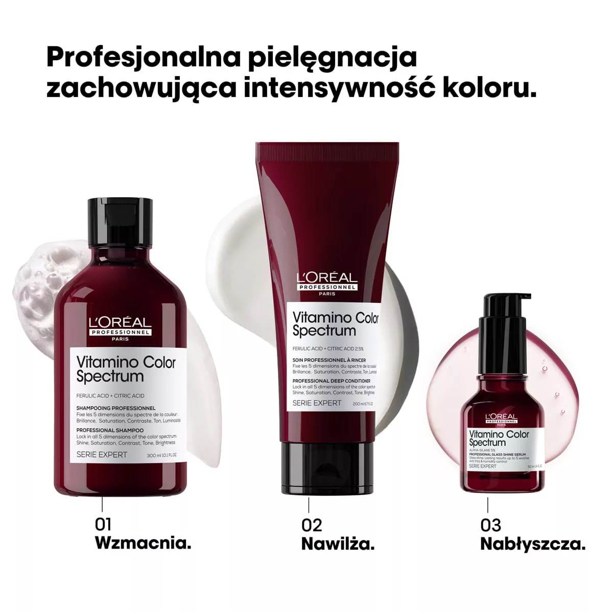 Pielęgnacja Vitamino Color Spectrum pomaga zachować intensywność koloru włosów od pierwszego dnia koloryzacji aż do 100 dni*. Zapewnia niezwykle wysoki połysk tafli lustra oraz bogate i żywe kolory. Włosy są oczyszczone, natychmiast odżywione i mocniejsze.