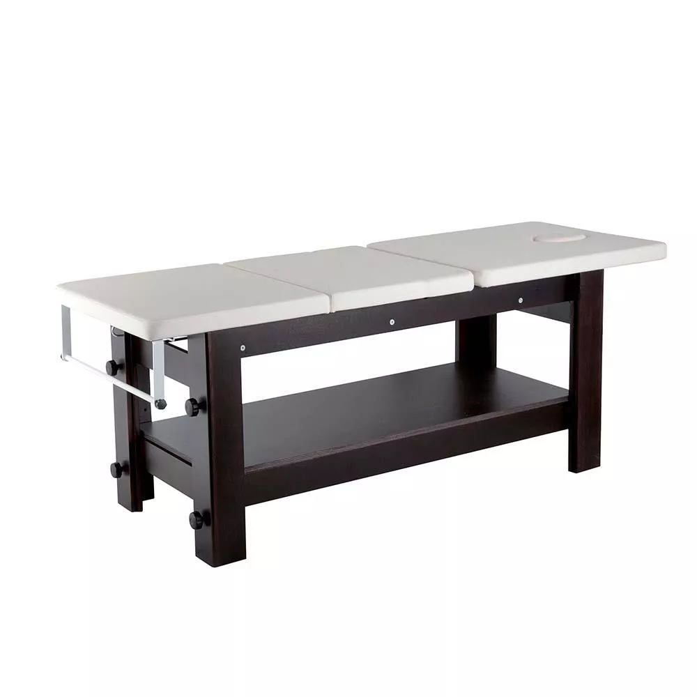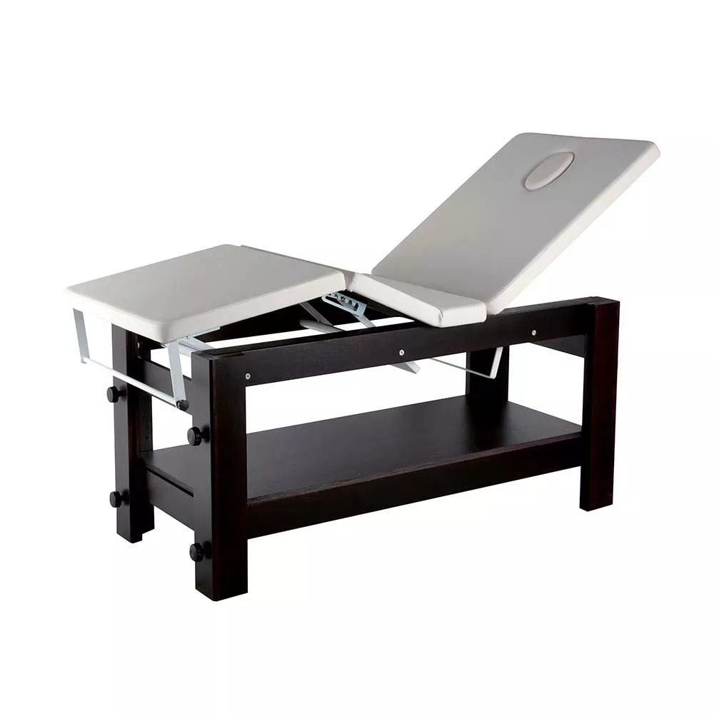 Tapicerka podzielona na 3 manualnie regulowane części [oparcie, część lędźwiowa, podnóżek], zintegrowany zagłówek posiada otwór na twarz.
