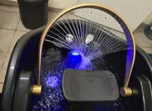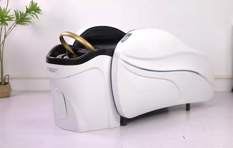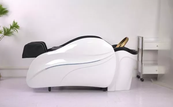 Wbudowane oświetlenie LED po bokach łóżka tworzy przyjemną atmosferę, a regulowany podgłówek wspiera ergonomię podczas długich zabiegów. Zintegrowana myjka z płaską aureolą i potrójnym natryskiem, wyposażona w baterię umywalkową i podświetlaną misę, umożliwia komfortowe mycie głowy oraz hydromasaż – także z funkcją zamkniętego obiegu wody i regulacją temperatury.
