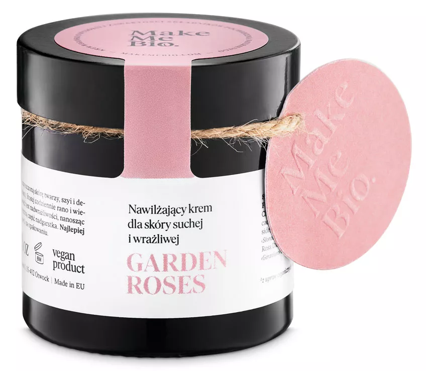 Specjalnie z myślą o skórze suchej i wrażiwej opracowano formułę kremu Make Me Bio Garden Roses. Działa on nawilżająco i tonizująco, przywracając skórze naturalne piękno. Krem regeneruje skórę twarzy i ujednolica ją, a także chroni cerę przed negatywnym wpływem niebezpiecznych czynników zewnętrznych. W składzie znajdują się hydrolaty z róży i geranium, a także olejki jojoba i migdałów, które działają nawilżająco. Poza tym krem zawiera olejki z orzeszków makadamia oraz masło mango, które silnie regenerują skórę, zmiękczają ją i wspomagają naturalne procesy regeneracyjne. Krem ma przyjemny, różany zapach.
