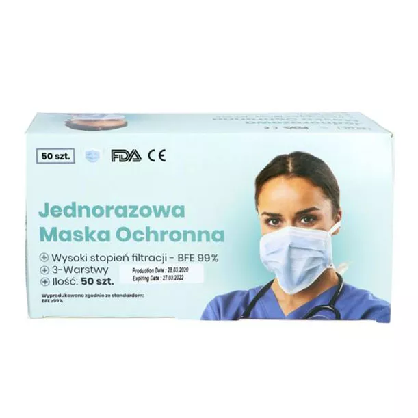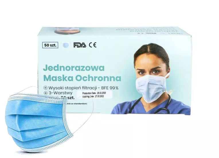 Maseczka ochronna na twarz zmniejsza ryzyko przedostania się zanieczyszczeń do dróg oddechowych. Maseczka cechuje się wysokim stopniem filtracji bakteryjnej BFE - 99%. Aż trzy warstwy zapewniają skuteczną ochronę i filtrowanie powietrza. Maseczka jest rozmiaru uniwersalnego, doskonale i dokładnie dopasowuje się do kształtu twarzy. Mocuje się ją za pomocą elastycznych gumek. Gumki są bardzo wygodne i nie pozostawiają bolesnych odcisków przy uszach. Maseczka jednorazowa, zaleca się zmianę maseczki po 4 godzinach noszenia.