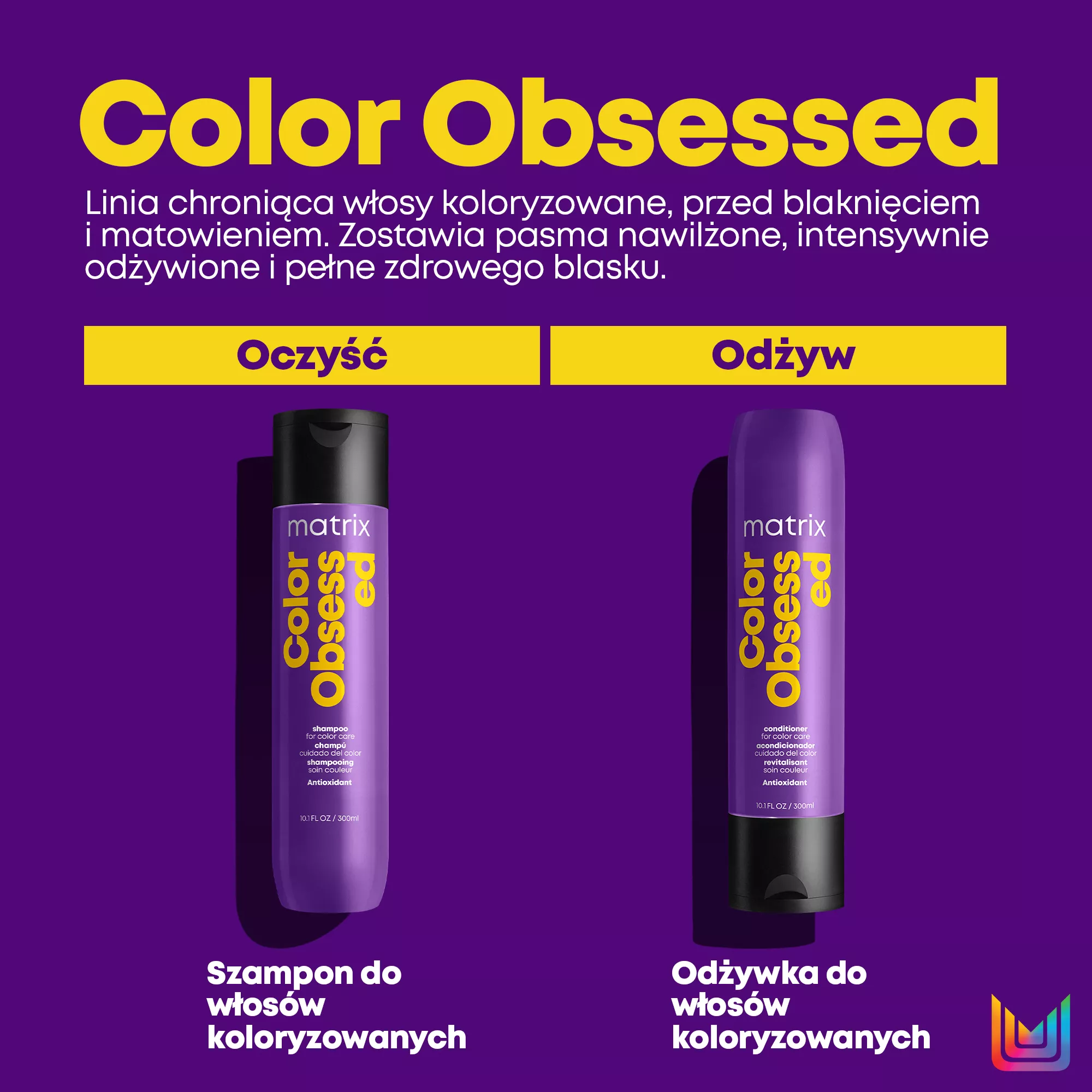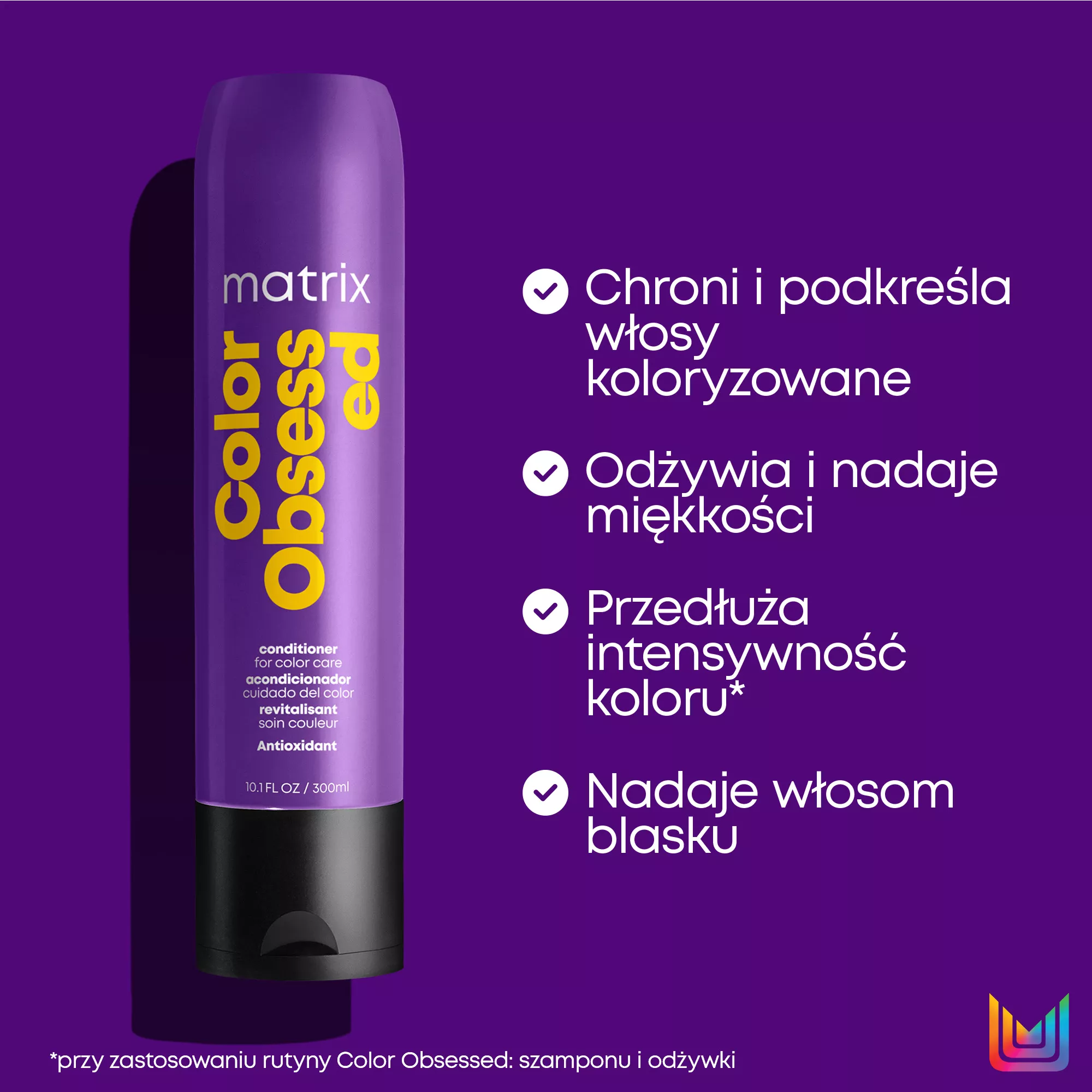 Odżywka do włosów Matrix Total Results Color Obsessed doskonale sprawdzi się w pielęgnacji włosów farbowanych. Unikalna formuła kosmetyku zawiera dodatkowe przeciwutleniacze, co powoduje podtrzymanie koloru. Odżywka świetnie przedłuża żywotność koloru, aż do 32 myć po koloryzacji. Formuła kosmetyku opiera się na technologii Fade Guard.