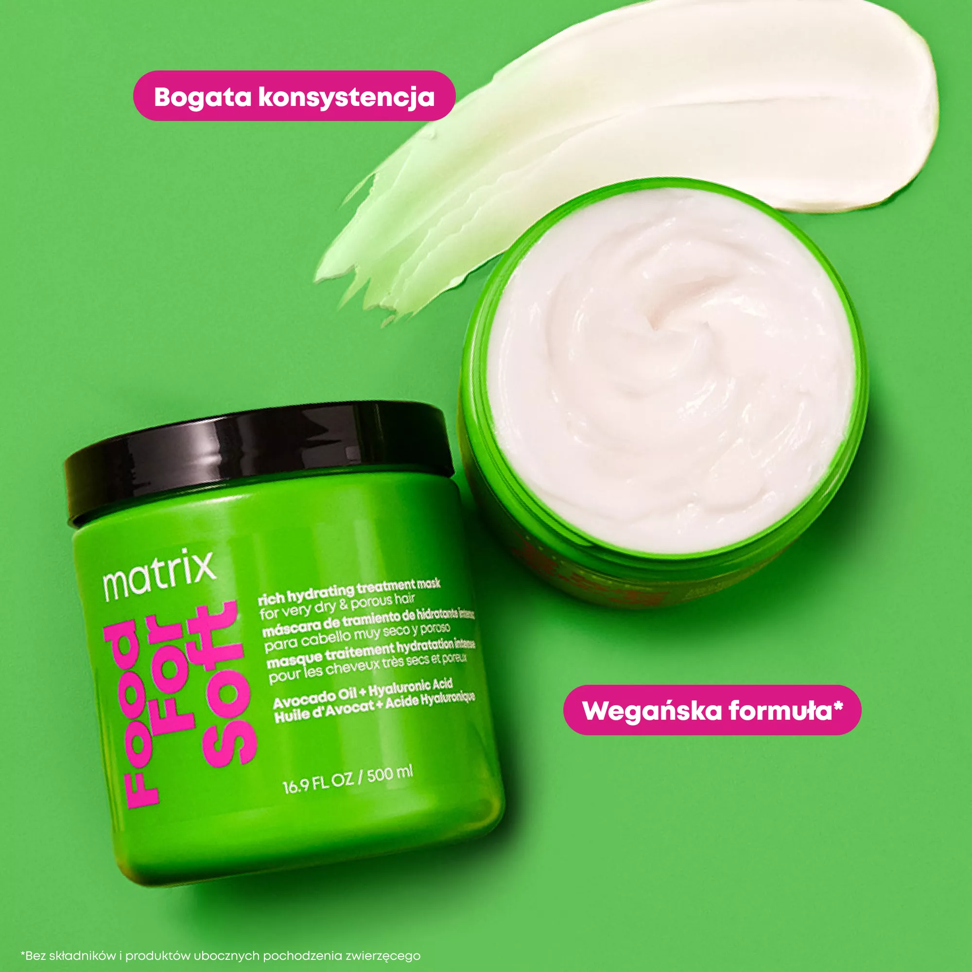 FOOD FOR SOFT to profesjonalna, intensywnie nawilżająca gama od Matrix do pielęgnacji wszystkich rodzajów suchych włosów. Zawiera ona olej z awokado i kwas hialuronowy. Przy zastosowaniu systemu składającego się z szamponu, odżywki lub maski i olejku* włosy zyskują 7x więcej nawilżenia oraz stają się odczuwalnie miękkie nawet do 72 godzin.** Dodatkowo olejek do włosów FOOD FOR SOFT chroni włosy przed negatywnym działaniem urządzeń termicznych do stylizacji (nawet do 230°C).* *W porównaniu do samego szamponu. **Test instrumentalny.