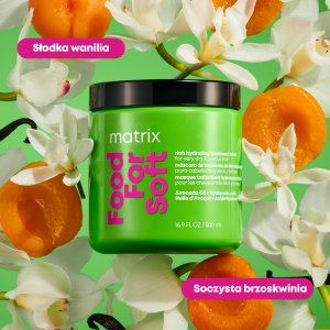 FOOD FOR SOFT to profesjonalna, intensywnie nawilżająca gama od Matrix do pielęgnacji wszystkich rodzajów suchych włosów. Zawiera ona olej z awokado i kwas hialuronowy. Przy zastosowaniu systemu składającego się z szamponu, odżywki lub maski i olejku* włosy zyskują 7x więcej nawilżenia oraz stają się odczuwalnie miękkie nawet do 72 godzin.** Dodatkowo olejek do włosów FOOD FOR SOFT chroni włosy przed negatywnym działaniem urządzeń termicznych do stylizacji (nawet do 230°C).* *W porównaniu do samego szamponu. **Test instrumentalny.