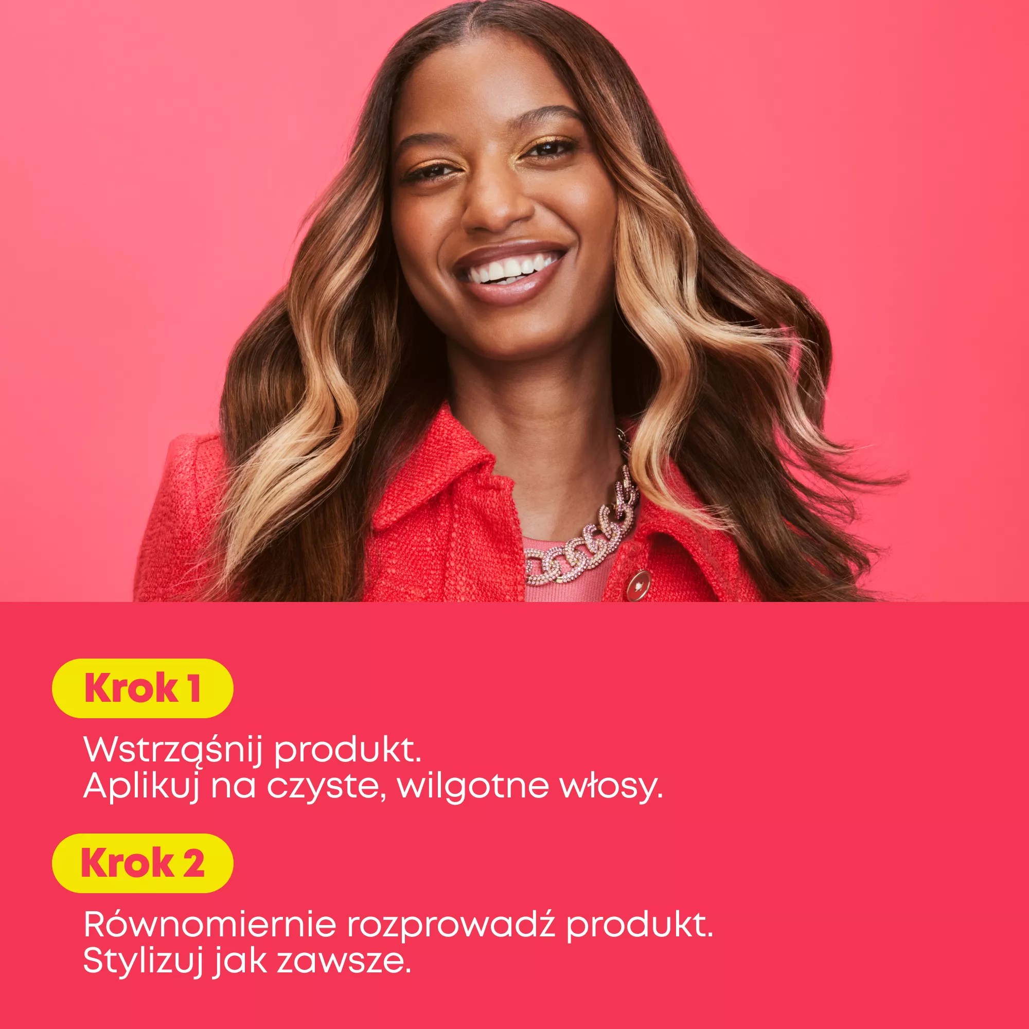 Wstrząśnij produkt. Aplikuj na czyste, wilgotne włosy i równomiernie rozprowadź produkt. Stylizuj jak zwykle. Unikaj kontaktu z oczami, skórą głowy i okolicą skóry. W przypadku dostania się preparatu do oczu, natychmiast przepłukać je woda.