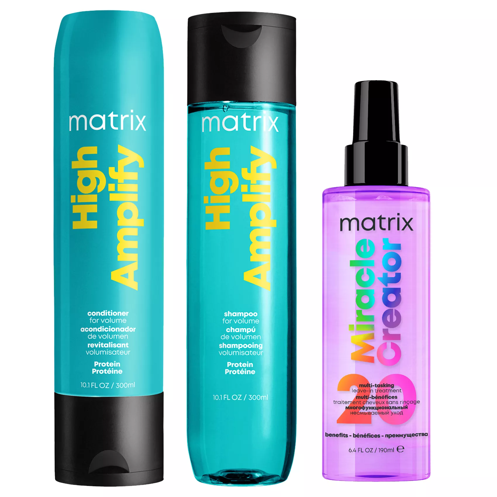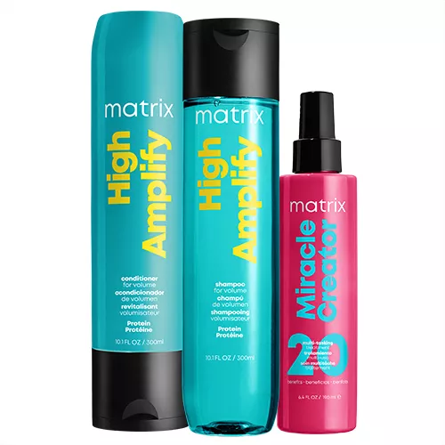 Twoje włosy cierpią na brak objętości? Są oklapnięte, cienkie i nie chcą się układać? Ich stylizację zacznij od odpowiedniej pielęgnacji. Pomoże Ci w tym gotowy zestaw kosmetyków do cienkich włosów Matrix High Amplify. W skład zestawu wchodzą szampon i odżywka, dające efekt dodatkowej objętości. W składzie tych kosmetyków znajdują się proteiny, które sprawiają, że włosy są przyjemnie puszyste, zyskują fenomenalną strukturę i cudowny kształt. Kosmetyki nie zawierają silikonów. Teraz ten kultowy zestaw dostępny z maską w sprayu Matrix Total Results Miracle Creator. To ekspresowa kuracja, która nawilża włosy, wzmacnia je, odżywia, poprawia wygląd, dodaje blasku i zapewnia termoochronę.