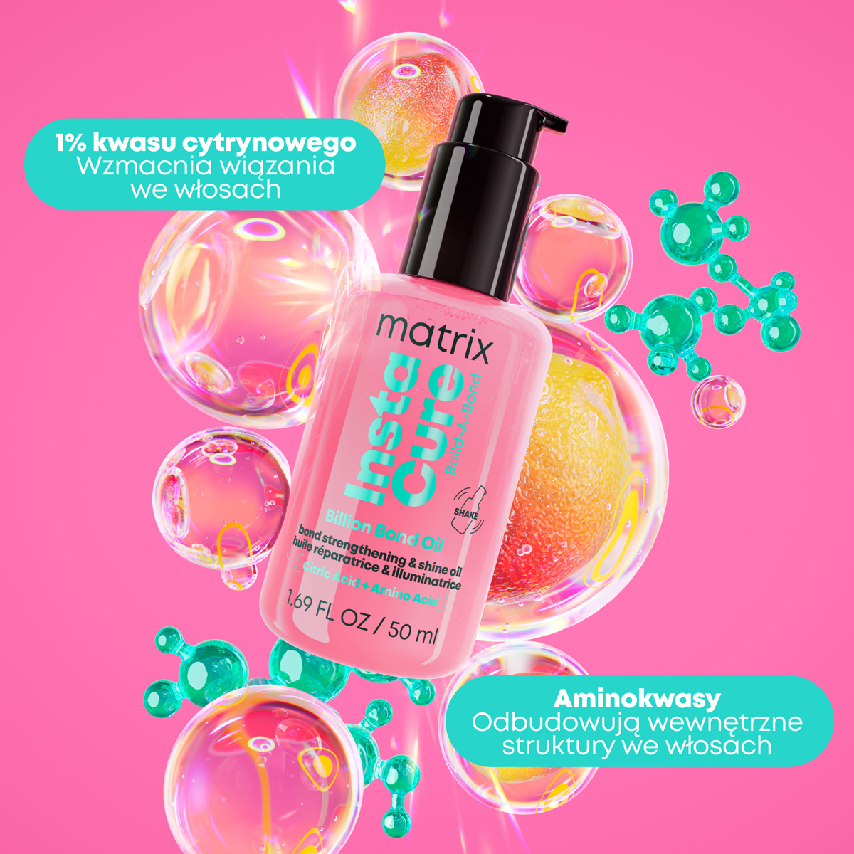 Olejek odbudowujący Instacure Build-A-Bond Billion Bond Oil od Matrix to miliard wiązań dla widocznej rekonstrukcji uszkodzeń. Zawiera kwas cytrynowy, który wzmacnia wiązania we włosach i aminokwas, który odbudowuje ich wewnętrzne struktury. Olejek dodaje włosom blasku nie obciążając ich. Szybko się wchłania, nie pozostawiając tłustej warstwy. Technologia bonding natychmiastowo regeneruje i wzmacnia włosy. Sprawia, że pasma łatwo się rozczesują i są miękkie w dotyku. Wygładza je i nadaje im jedwabisty połysk.