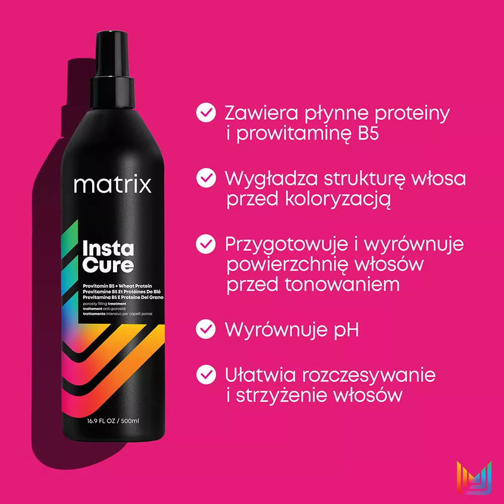 Spray przed koloryzacją włosów Matric Pro BackBar Insta Cure domyka łuski włosów i wyrównuje porowatość, dzięki czemu kolory wychodzi jednolity i lśniący. To idealny produkt przed tonowaniem pasm oraz koloryzacją. Lekka formuła nie obciąża włosów, a zrównoważone pH jest bezpieczne dla włosów i skóry głowy. Łatwe stosowanie.