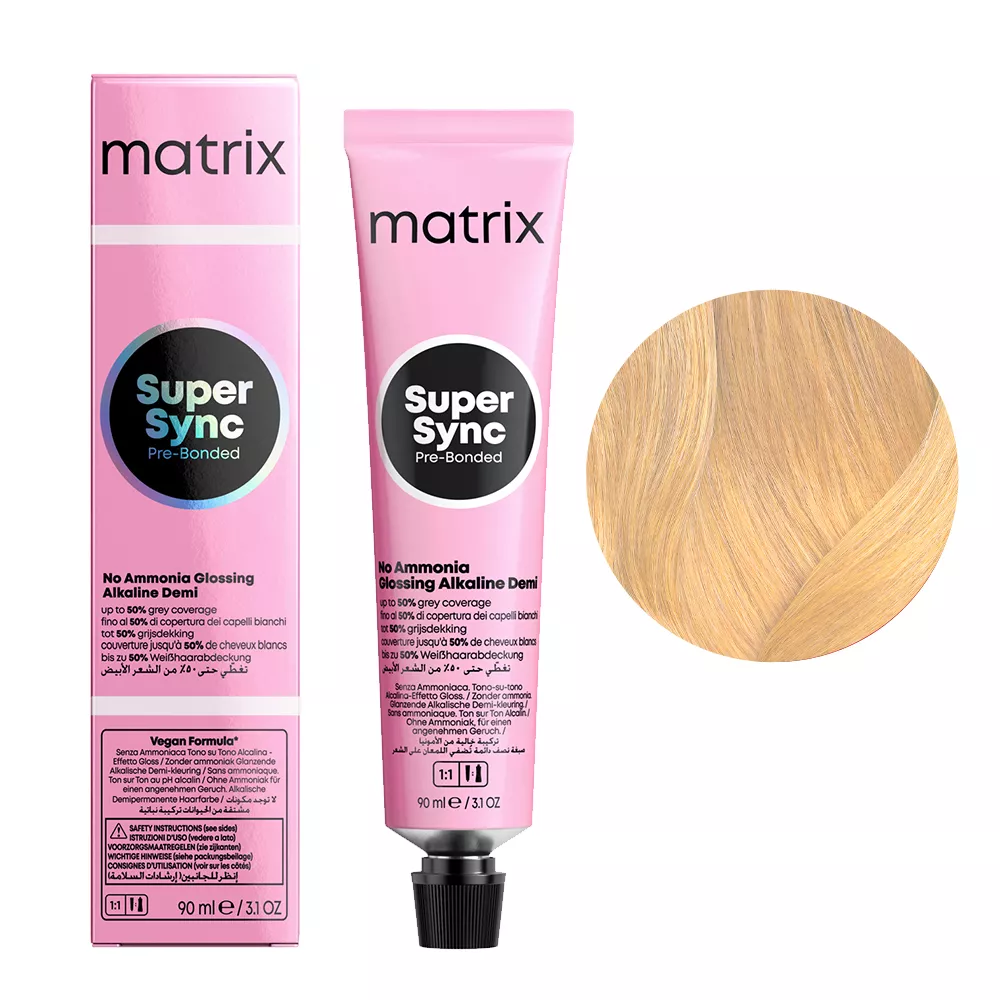 Alkaiczny toner do włosów Matrix Super Sync Pre-Bonded to rozświetlające tonery alkaliczne dające nawet 2 razy więcej blasku z całkowicie nowym kompleksem Pre-Bonded dla natychmiastowej ochrony struktury włosa. Zapewniają pokrycie do 50% siwych włosów. Pojemność 90 ml starcza nawet do 2 aplikacji. Formuła wegańska.