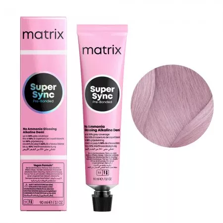 Alkaiczny toner do włosów Matrix Super Sync Pre-Bonded to rozświetlające tonery alkaliczne dające nawet 2 razy więcej blasku z całkowicie nowym kompleksem Pre-Bonded dla natychmiastowej ochrony struktury włosa. Zapewniają pokrycie do 50% siwych włosów. Pojemność 90 ml starcza nawet do 2 aplikacji. Formuła wegańska.
