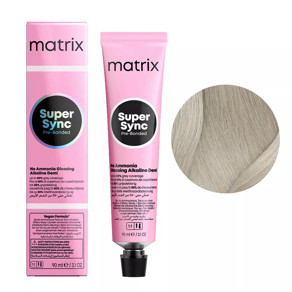 Alkaiczny toner do włosów Matrix Super Sync Pre-Bonded to rozświetlające tonery alkaliczne dające nawet 2 razy więcej blasku z całkowicie nowym kompleksem Pre-Bonded dla natychmiastowej ochrony struktury włosa. Zapewniają pokrycie do 50% siwych włosów. Pojemność 90 ml starcza nawet do 2 aplikacji. Formuła wegańska.
