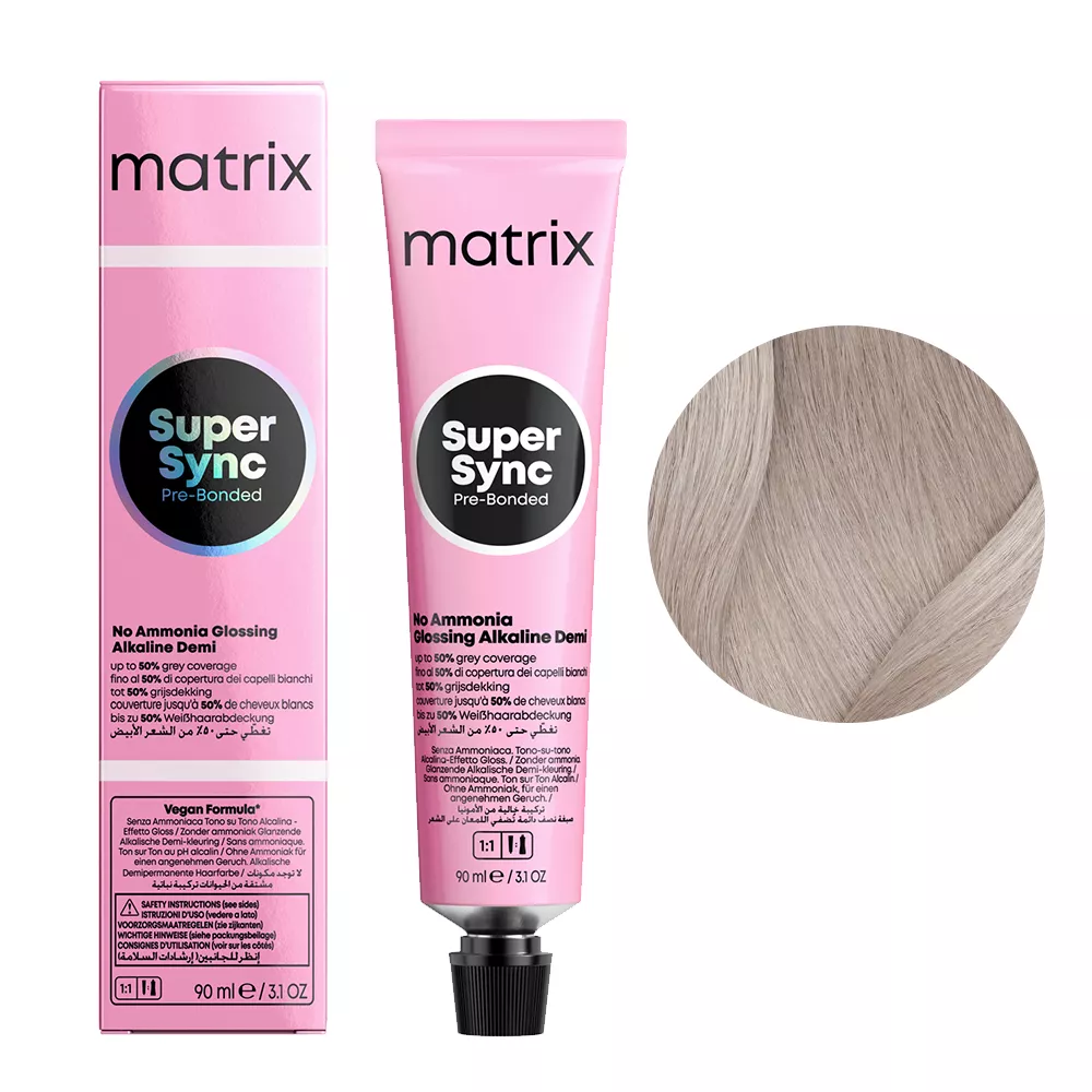 Alkaiczny toner do włosów Matrix Super Sync Pre-Bonded to rozświetlające tonery alkaliczne dające nawet 2 razy więcej blasku z całkowicie nowym kompleksem Pre-Bonded dla natychmiastowej ochrony struktury włosa. Zapewniają pokrycie do 50% siwych włosów. Pojemność 90 ml starcza nawet do 2 aplikacji. Formuła wegańska.