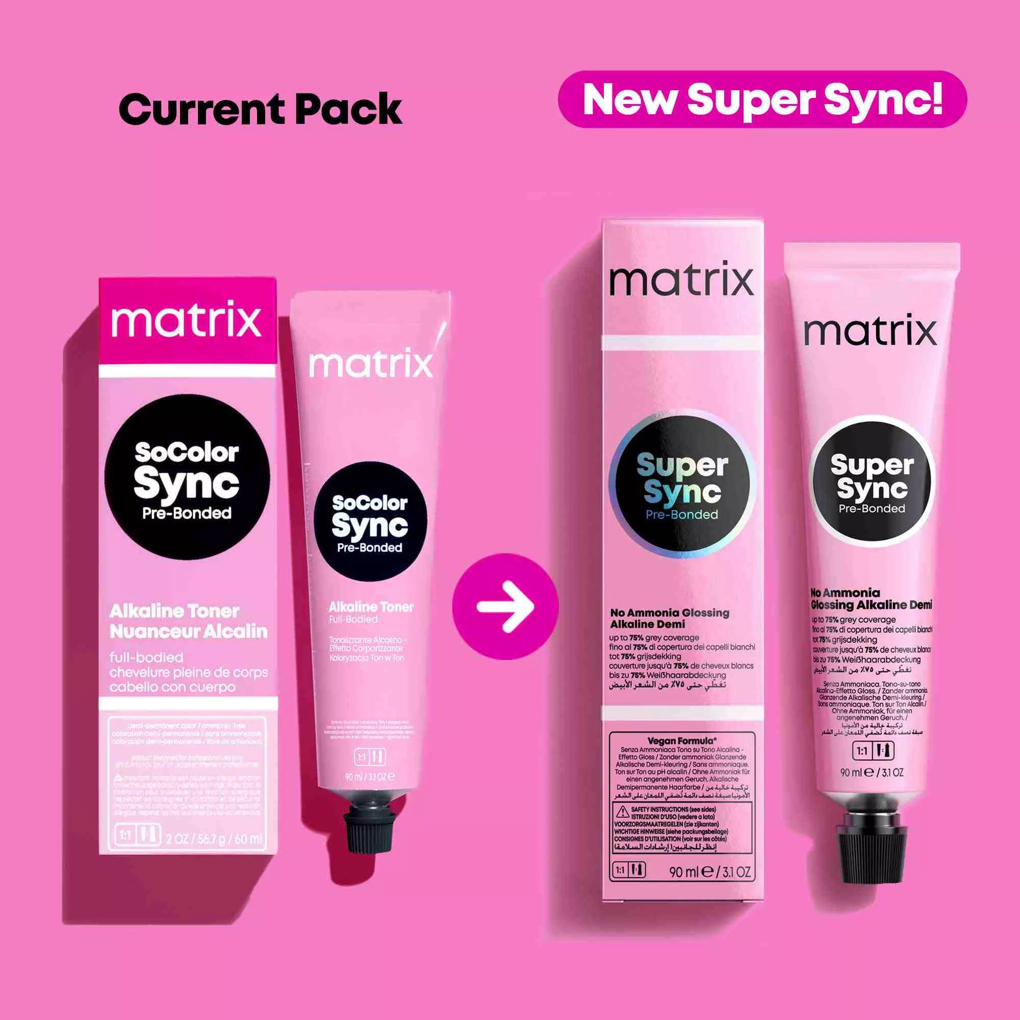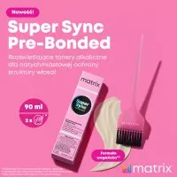 Alkaiczny toner do włosów Matrix Super Sync Pre-Bonded to rozświetlające tonery alkaliczne dające nawet 2 razy więcej blasku z całkowicie nowym kompleksem Pre-Bonded dla natychmiastowej ochrony struktury włosa. Zapewniają pokrycie do 50% siwych włosów. Pojemność 90 ml starcza nawet do 2 aplikacji. Formuła wegańska.