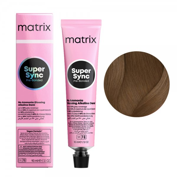 Alkaiczny toner do włosów Matrix Super Sync Pre-Bonded to rozświetlające tonery alkaliczne dające nawet 2 razy więcej blasku z całkowicie nowym kompleksem Pre-Bonded dla natychmiastowej ochrony struktury włosa. Zapewniają pokrycie do 50% siwych włosów. Pojemność 90 ml starcza nawet do 2 aplikacji. Formuła wegańska.