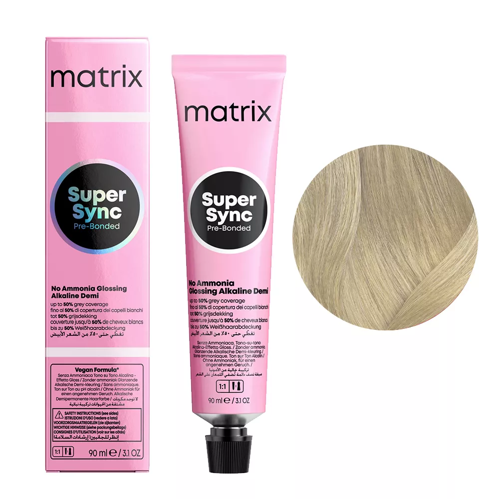 Alkaiczny toner do włosów Matrix Super Sync Pre-Bonded to rozświetlające tonery alkaliczne dające nawet 2 razy więcej blasku z całkowicie nowym kompleksem Pre-Bonded dla natychmiastowej ochrony struktury włosa. Zapewniają pokrycie do 50% siwych włosów. Pojemność 90 ml starcza nawet do 2 aplikacji. Formuła wegańska.