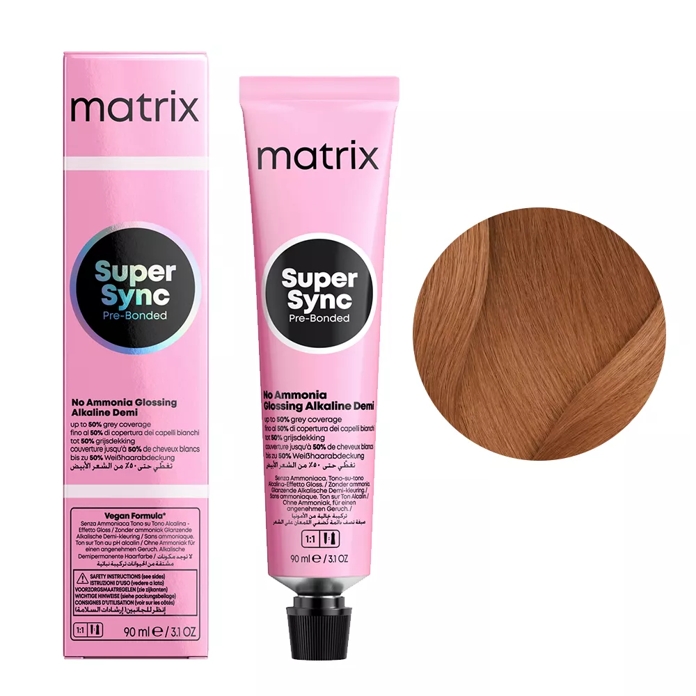 Alkaiczny toner do włosów Matrix Super Sync Pre-Bonded to rozświetlające tonery alkaliczne dające nawet 2 razy więcej blasku z całkowicie nowym kompleksem Pre-Bonded dla natychmiastowej ochrony struktury włosa. Zapewniają pokrycie do 50% siwych włosów. Pojemność 90 ml starcza nawet do 2 aplikacji. Formuła wegańska.