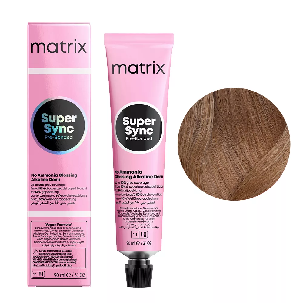 Alkaiczny toner do włosów Matrix Super Sync Pre-Bonded to rozświetlające tonery alkaliczne dające nawet 2 razy więcej blasku z całkowicie nowym kompleksem Pre-Bonded dla natychmiastowej ochrony struktury włosa. Zapewniają pokrycie do 50% siwych włosów. Pojemność 90 ml starcza nawet do 2 aplikacji. Formuła wegańska.