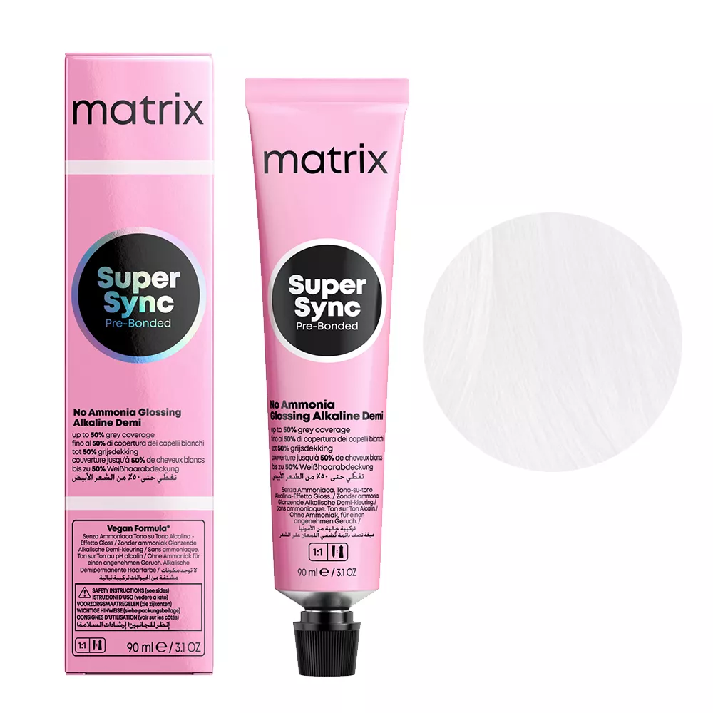 Alkaiczny toner do włosów Matrix Super Sync Pre-Bonded to rozświetlające tonery alkaliczne dające nawet 2 razy więcej blasku z całkowicie nowym kompleksem Pre-Bonded dla natychmiastowej ochrony struktury włosa. Zapewniają pokrycie do 50% siwych włosów. Pojemność 90 ml starcza nawet do 2 aplikacji. Formuła wegańska.