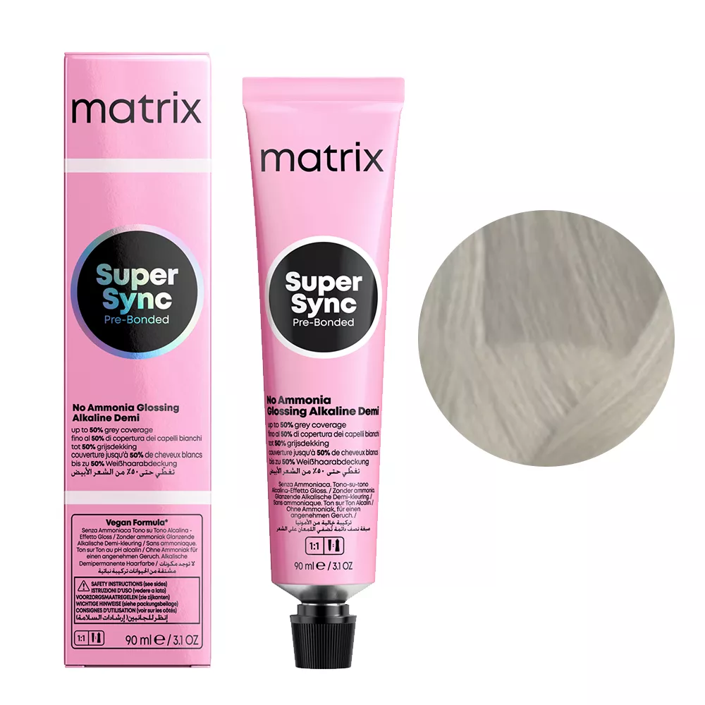 Alkaiczny toner do włosów Matrix Super Sync Pre-Bonded to rozświetlające tonery alkaliczne dające nawet 2 razy więcej blasku z całkowicie nowym kompleksem Pre-Bonded dla natychmiastowej ochrony struktury włosa. Zapewniają pokrycie do 50% siwych włosów. Pojemność 90 ml starcza nawet do 2 aplikacji. Formuła wegańska.
