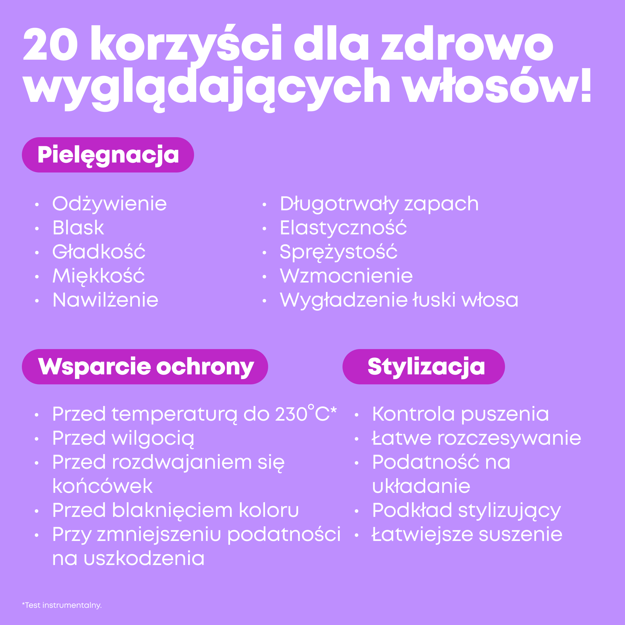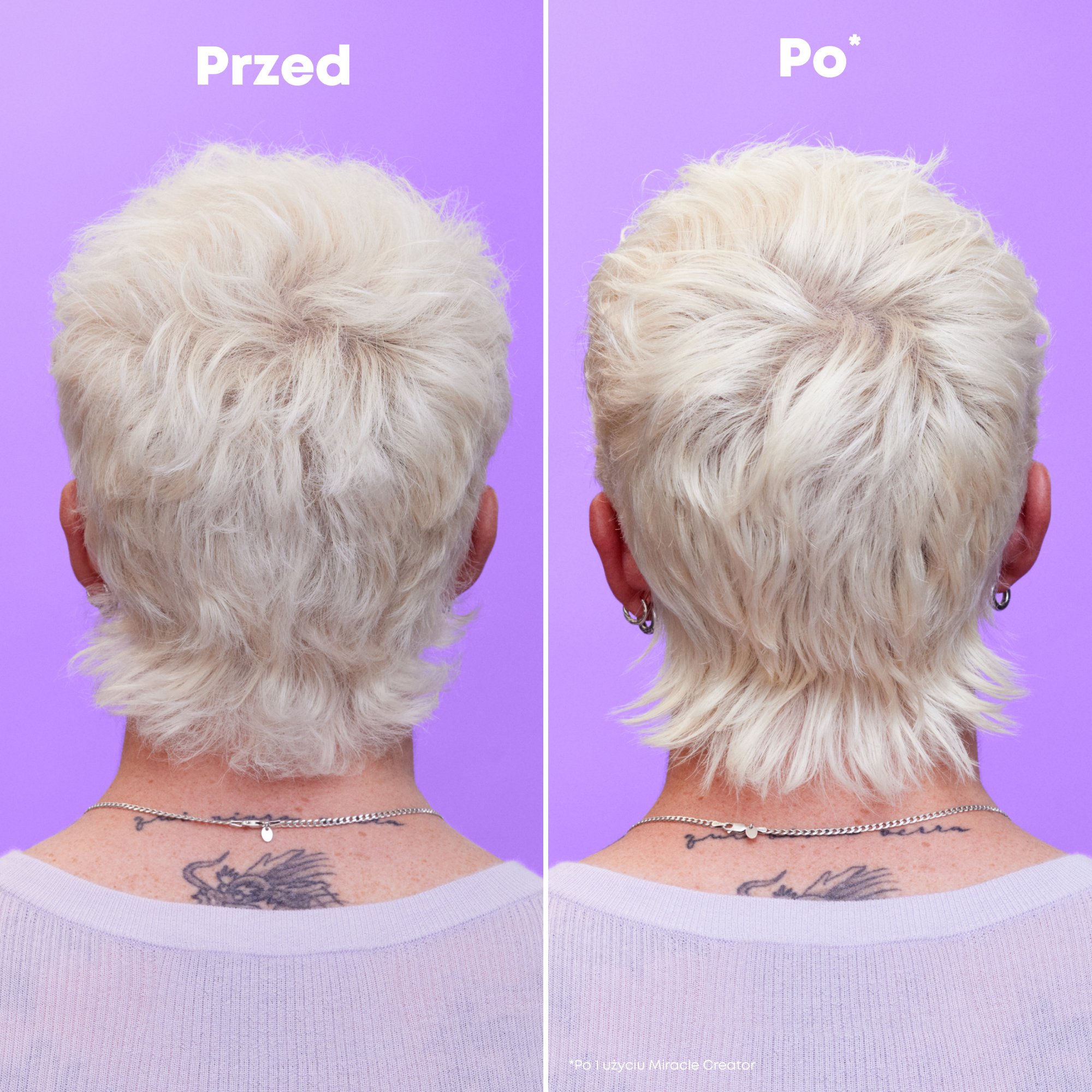 Miracle Creator to wielozadaniowa pielęgnacja bez spłukiwania z 20 korzyściami dla zdrowo wyglądających włosów! Stosuj zawsze, gdy Twoje włosy potrzebują: odżywienia, wzmocnienia połysku, gładkości, łatwiejszego suszenia, kontroli puszenia, wygładzenia łuski włosa, zmiękczenia, ochrony przed rozdwajaniem się końcówek, nawilżenia, zmniejszenia podatności na uszkodzenia, ochrony przed wilgocią, ułatwienia w rozczesywaniu, zwiększenia podatności na układanie, podkładu stylizującego, ochrony przed blaknięciem koloru, podkreślenia, wzmocnienia, długotrwałego zapachu, sprężystości oraz ochrony przed wysoką temperaturą 230oC!*