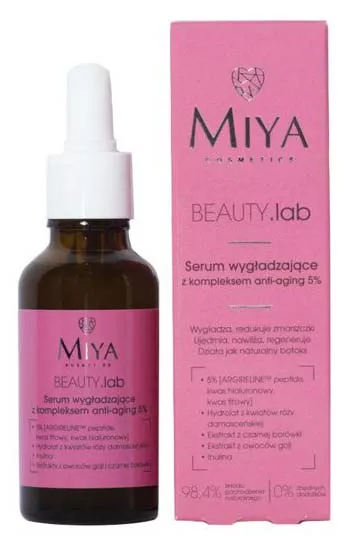 Miya BEAUTY.lab, serum wygładzające z kompleksem anti-aging 5% to innowacyjne rozwiązanie dla osób pragnących zachować młody wygląd skóry bez ingerencji chirurgicznej. To serum działa jak naturalny botoks, zapewniając skórze jędrność, elastyczność i blask. Idealne dla każdego typu skóry, w tym naczynkowej i wrażliwej, a także bezpieczne do stosowania w okolicach oczu.