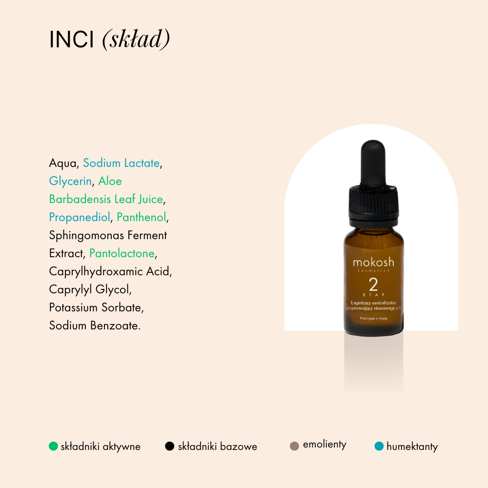 2. Łagodzący neutralizator przywracający równowagę pH: Aqua, Sodium Lactate, Glycerin, Aloe Barbadensis Leaf Juice, Propanediol, Panthenol, Sphingomonas Ferment Extract, Pantolactone, Caprylhydroxamic Acid, Caprylyl Glycol, Potassium Sorbate, Sodium Benzoate.