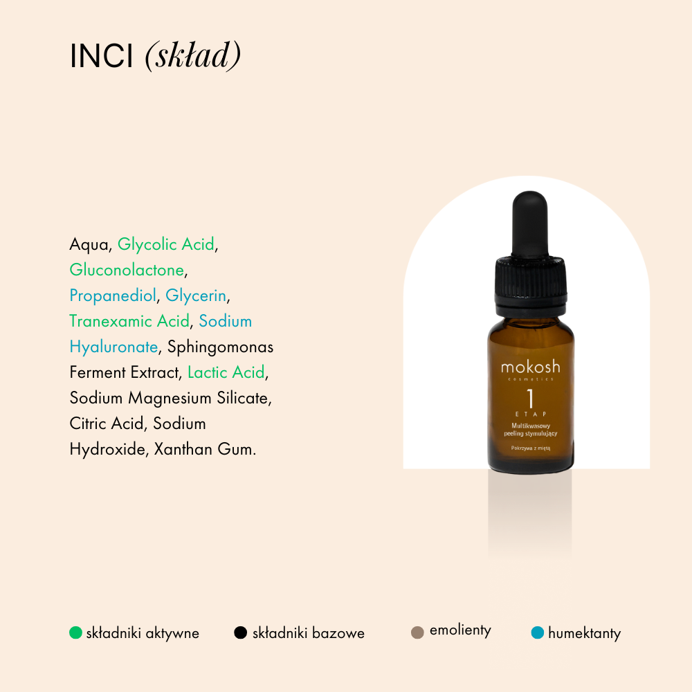 1. Multikwasowy peeling stymulujący: Aqua, Glycolic Acid, Gluconolactone, Propanediol, Glycerin, Tranexamic Acid, Sodium Hyaluronate, Sphingomonas Ferment Extract, Lactic Acid, Sodium Magnesium Silicate, Citric Acid, Sodium Hydroxide, Xanthan Gum.