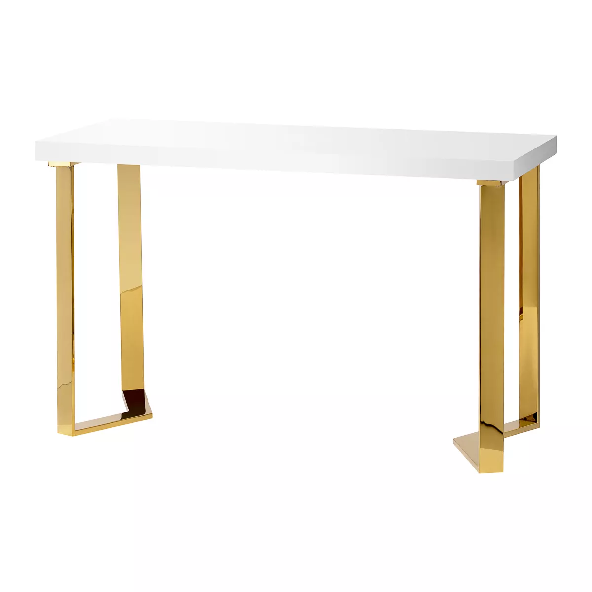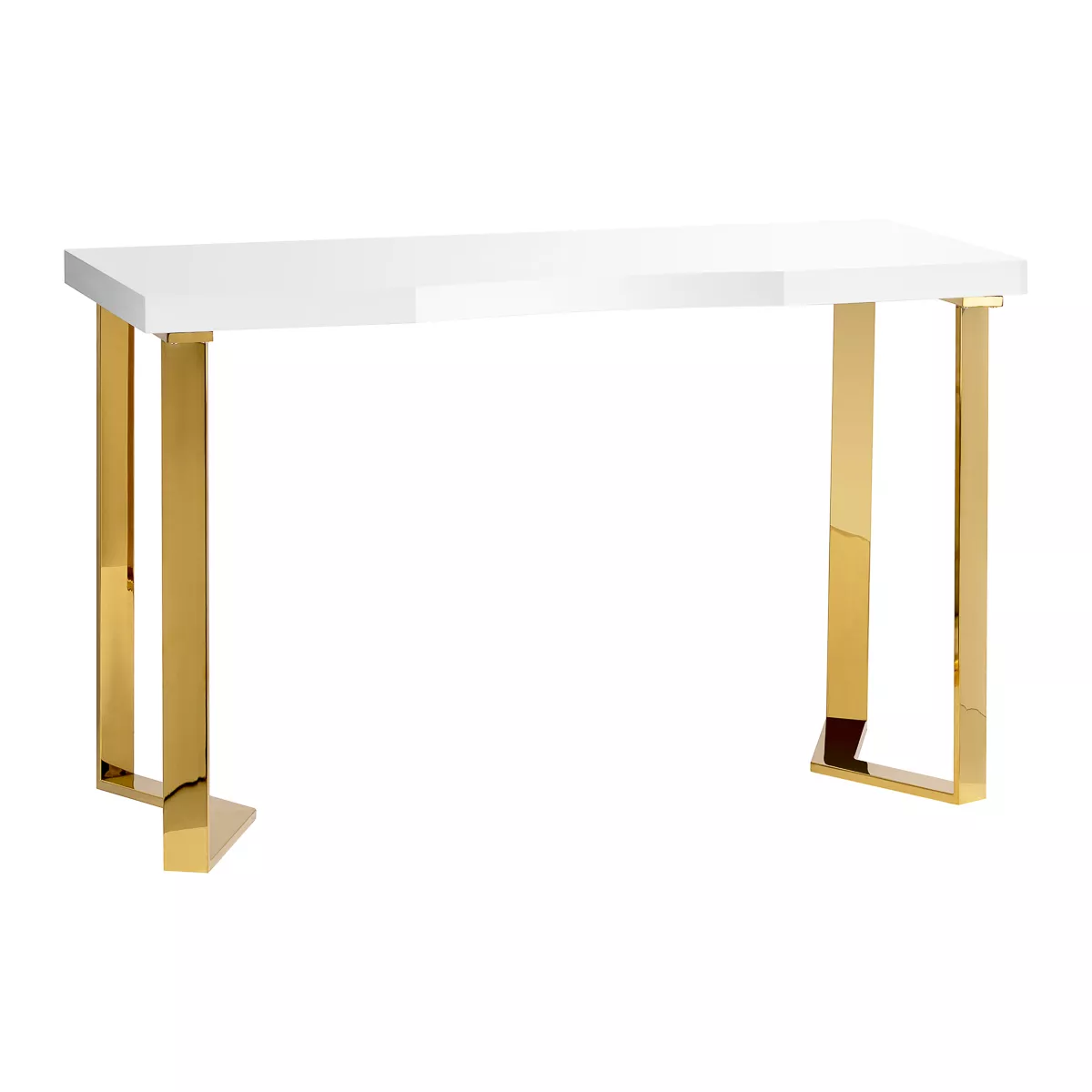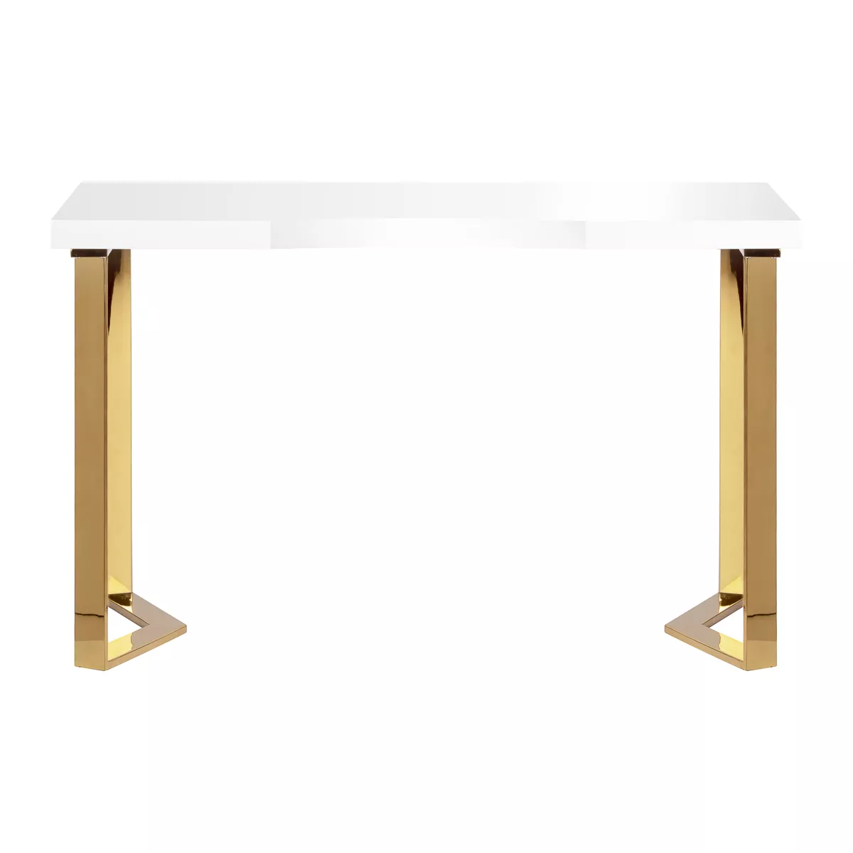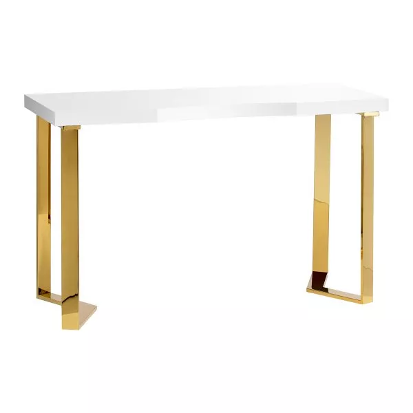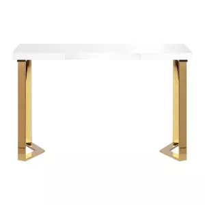 Nowoczesna forma biurka, łącząca biały blat ze złotymi, geometrycznymi nogami, dodaje wnętrzu lekkości i elegancji. Dzięki swojej kompaktowej, a zarazem stylowej formie, biurko doskonale sprawdzi się zarówno w małych gabinetach, jak i większych, nowoczesnych wnętrzach.