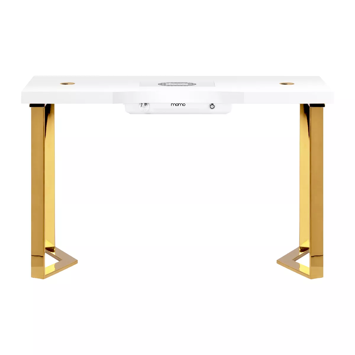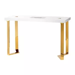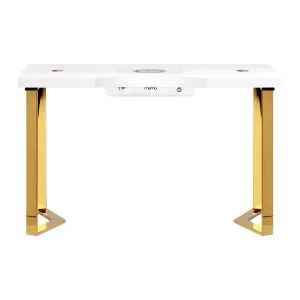Biurko kosmetyczne Momo 05 to wyjątkowe połączenie prostoty i stylu, zaprojektowane z myślą o wymagających użytkownikach. Minimalistyczny design ze złotymi elementami dodaje mu eleganckiego charakteru. Gładki blat na wysoki połysk gwarantuje komfort podczas wykonywania codziennych obowiązków w salonie kosmetycznym.