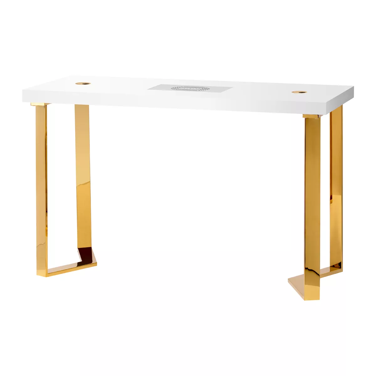 Nowoczesna forma biurka, łącząca biały blat ze złotymi, geometrycznymi nogami, dodaje wnętrzu lekkości i elegancji. Przemyślane detale, takie jak zintegrowane otwory na przewody czy montaż akcesoriów, pomagają utrzymać porządek na stanowisku pracy. Dzięki swojej kompaktowej, a zarazem stylowej formie, biurko doskonale sprawdzi się zarówno w małych gabinetach, jak i większych, nowoczesnych wnętrzach.