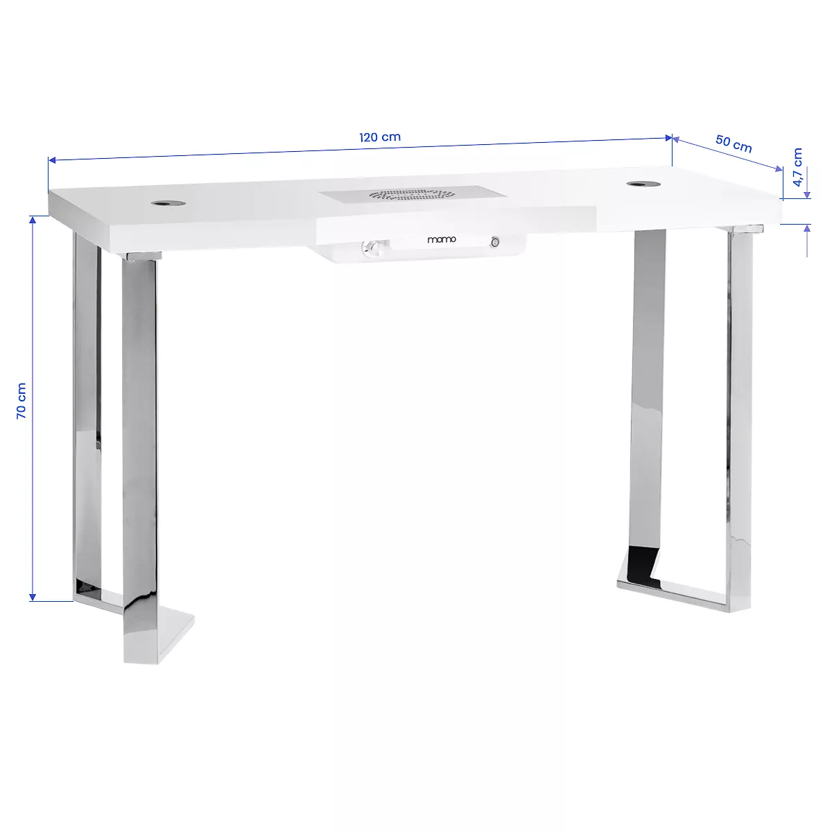 Biurko kosmetyczne Momo 05 to wyjątkowe połączenie prostoty i stylu, zaprojektowane z myślą o wymagających użytkownikach. Minimalistyczny design ze srebrnymi elementami dodaje mu eleganckiego charakteru. Gładki blat na wysoki połysk gwarantuje komfort podczas wykonywania codziennych obowiązków w salonie kosmetycznym.