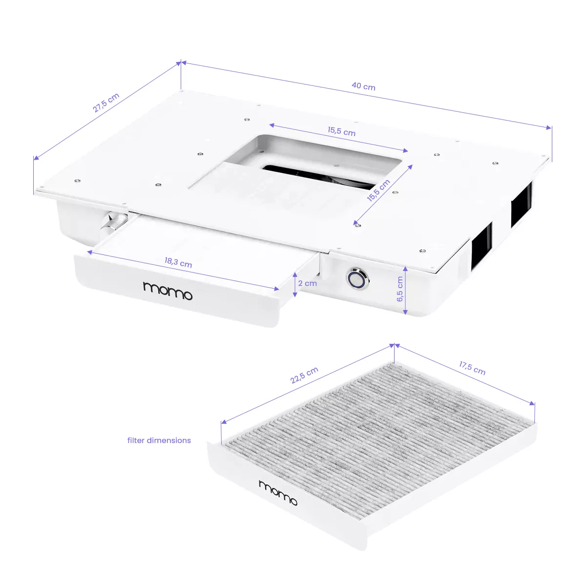 Kasetowy pochłaniacz pyłu Momo Professional J-02 to nowoczesne urządzenie stworzone z myślą o stylistkach paznokci. Cztery wydajne wentylatory i wysokiej jakości filtr kasetowy skutecznie usuwają pył powstający podczas stylizacji, chroniąc drogi oddechowe zarówno stylistki, jak i klienta. Dzięki montażowi w blacie biurka urządzenie nie zajmuje dodatkowej przestrzeni roboczej, zapewniając wygodę i ergonomię pracy.
