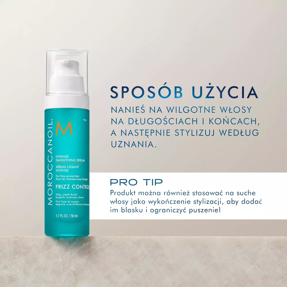 Nałóż niewielką ilość serum Moroccanoil Frizz Control na wilgotne lub suche włosy. Rozprowadź równomiernie na całej długości – od nasady aż po końcówki. Nie spłukuj. Dla uzyskania najlepszych efektów stosuj regularnie, zwłaszcza przed stylizacją lub w warunkach wysokiej wilgotności.