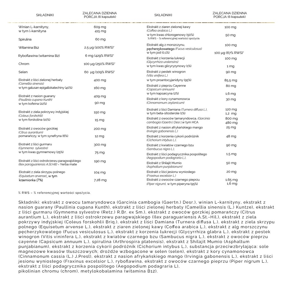 Zaleca się przyjmowanie 3 kapsułek przed pierwszym i 3 kapsułek przed głównym posiłkiem, popijając je co najmniej 250 ml wody. Po 3 miesiącach stosowania produktu zaleca się zrobić 3-4 tygodniową przerwę. Ze względu na zawartość kofeiny, suplement należy przyjmować w pierwszej połowie dnia.
