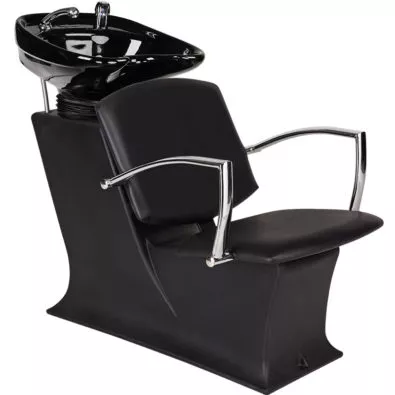 Myjnia Ayala Lady Y z fotelem Pako w czarnym kolorze tapicerki. Myjnia z chromowanymi podłokietnikami.