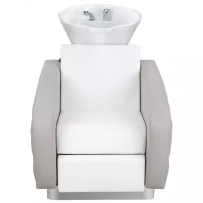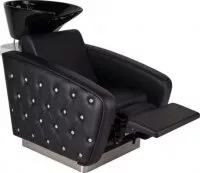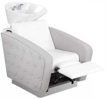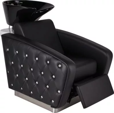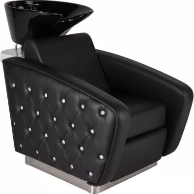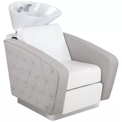 Wyposażona w porcelanową, osadzoną na wahaczu misę myjnia fryzjerska AYALA Obsession. Myjnia wolnostojąca w całości tapicerowana posiadająca zastosowany po raz I w Polsce dwuczęściowy podnóżek elektryczny dający dużą wygodę klientowi. Boki myjni zdobione kryształami Swarovski Elements.