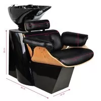 Wymiary myjni: Szczegółowe wymiary myjni fryzjerskiej są podane na jednym ze zdjęć, co ułatwia dopasowanie jej do przestrzeni salonu.