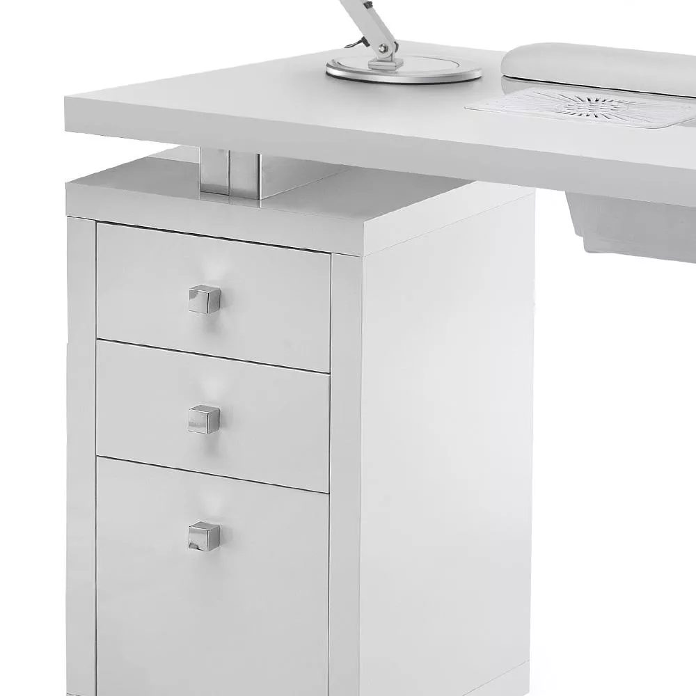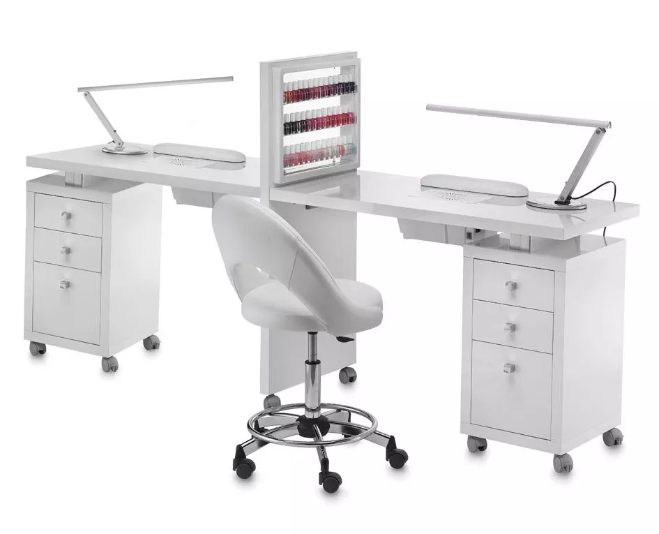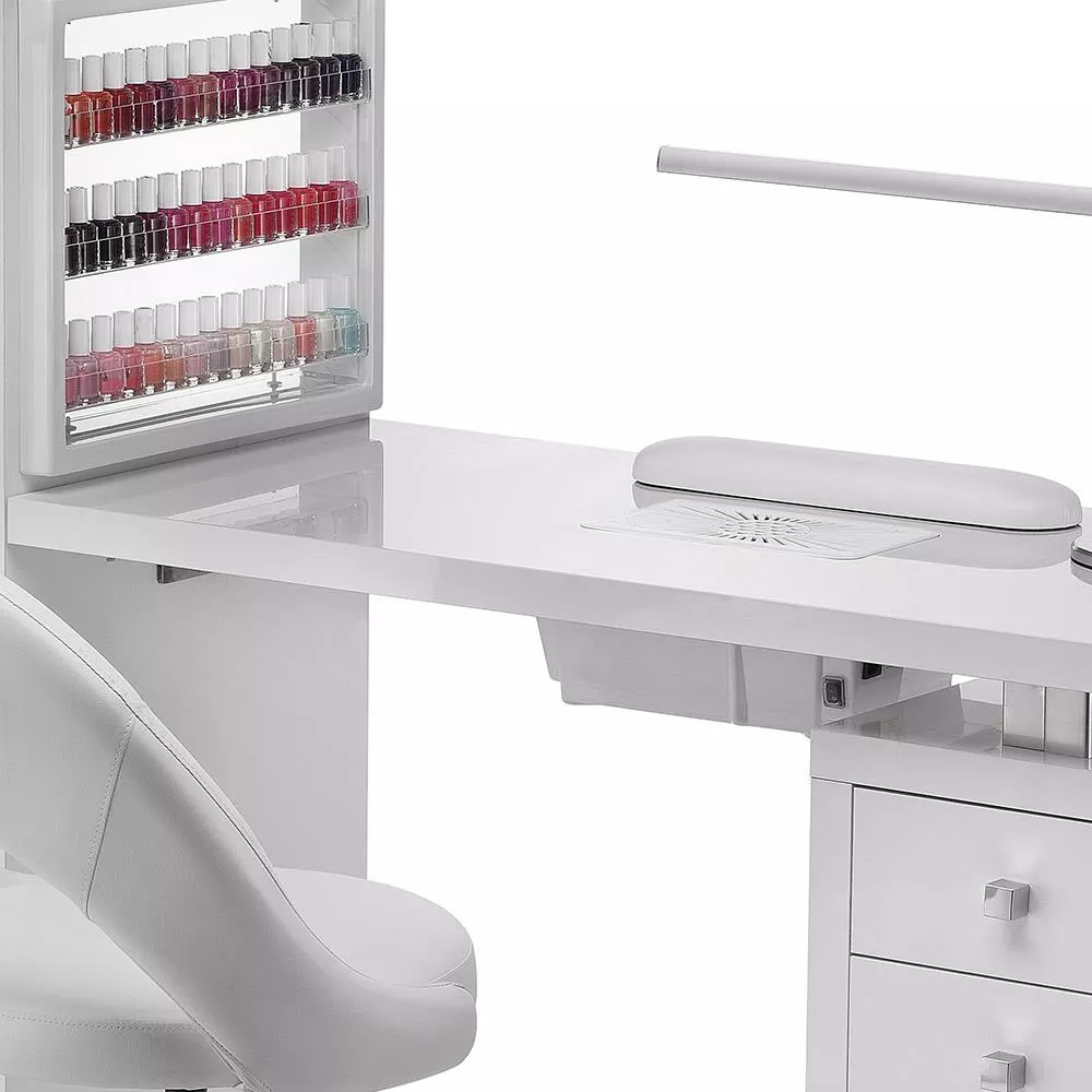 Blaty stołu z lakierowanego drewna są duże i pozwalają na swobodną pracę, wszystkie niezbędne urządzenia do usług manicure znajdują swoje miejsce na stole bez zakłócania pracy operatora. Lakierowanie blatu ma specjalną ochronę, która pozwala na jego czyszczenie acetonem bez ryzyka uszkodzenia powierzchni.