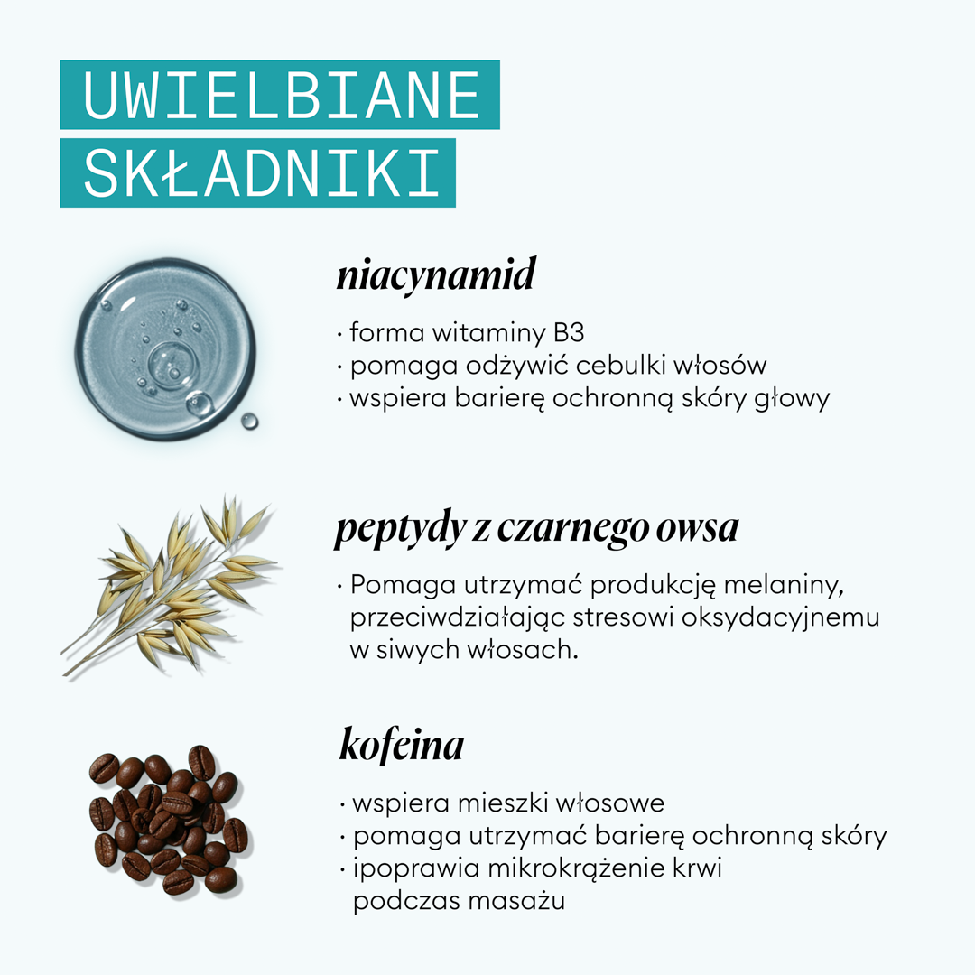 Lekka formuła na bazie peptydów czarnego owsa, niacynamidu oraz kofeiny – składniki te pobudzają mieszki włosowe i wspierają naturalną pigmentację.