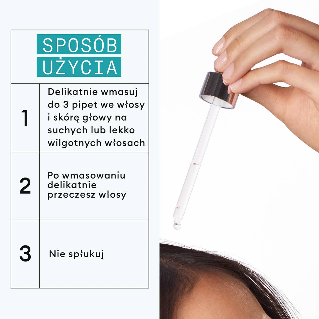 Delikatnie wmasuj w skórę głowy maksymalnie 3 pipety produktu. Nie spłukuj. Stosuj codziennie dla osiągnięcia najlepszych rezultatów.