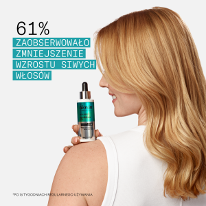 Aż 61% osób stosujących serum przez 16 tygodni zaobserwowało zmniejszenie wzrostu siwych włosów*.