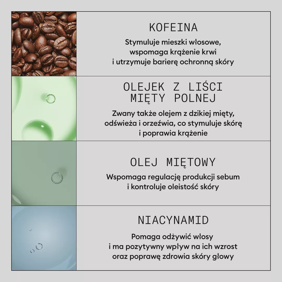 - Kofeina – stymuluje cebulki włosów, wspomaga wzrost i zwiększa objętość