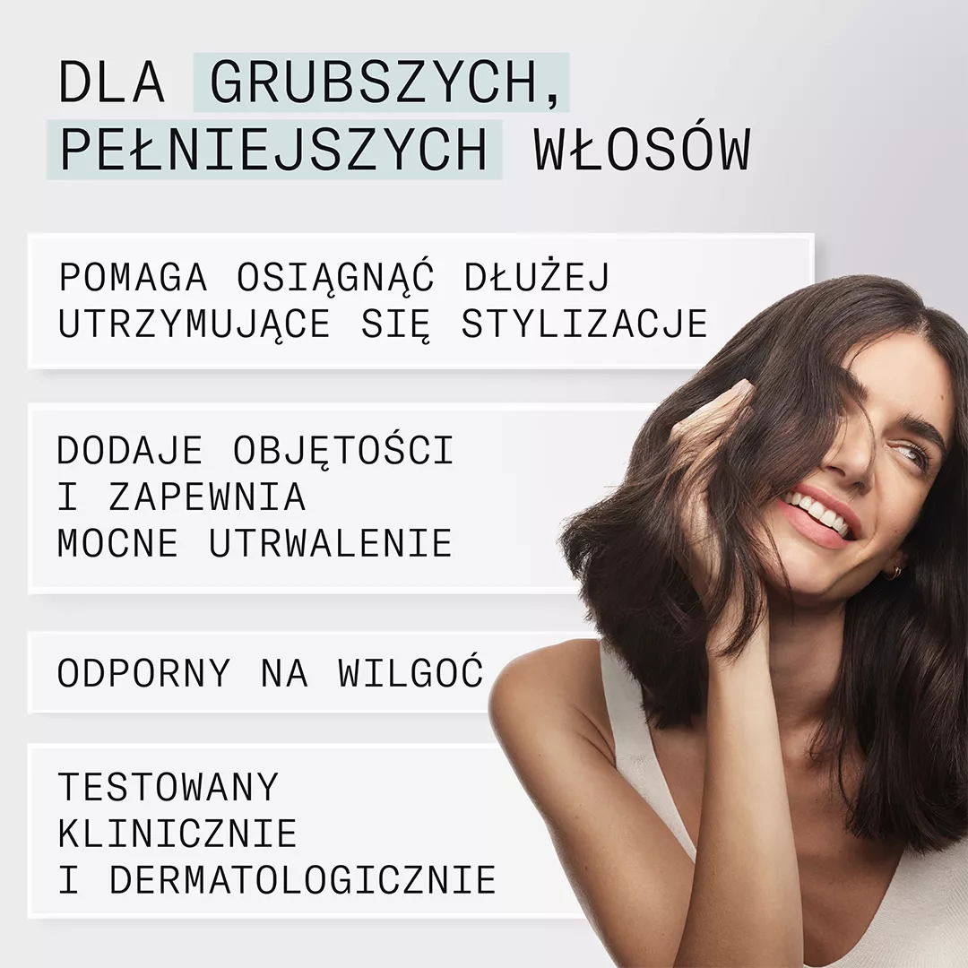 - Zapewnia mocne utrwalenie fryzury przez cały dzień bez efektu sztywności czy łuszczenia się.