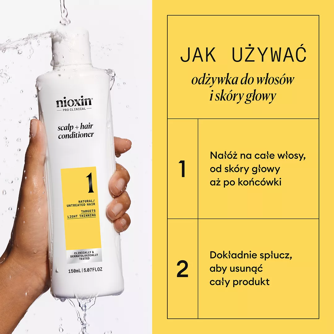 - Po umyciu włosów szamponem Nioxin System 1, nałóż odżywkę na skórę głowy i włosy.