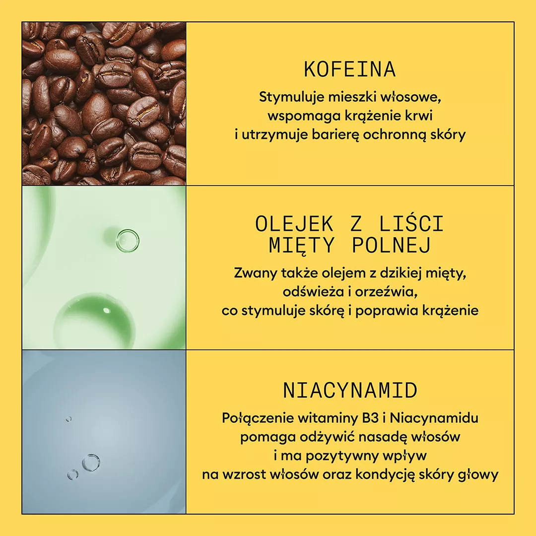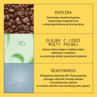 - Zaawansowana formuła z niacynamidem, olejkiem z dzikiej mięty i kofeiną stymuluje mieszki włosowe, odżywia cebulki i wspiera zdrowy wzrost.